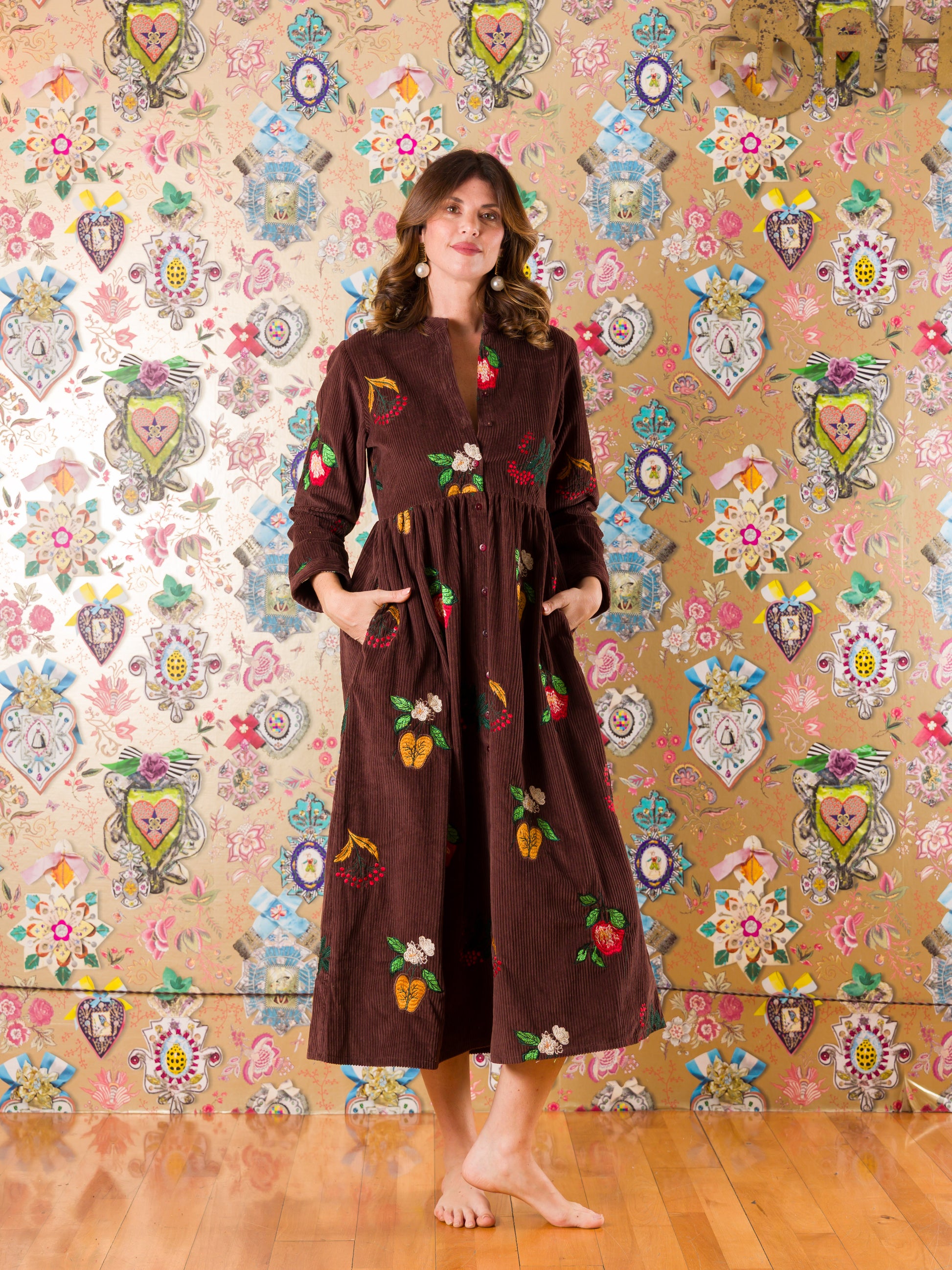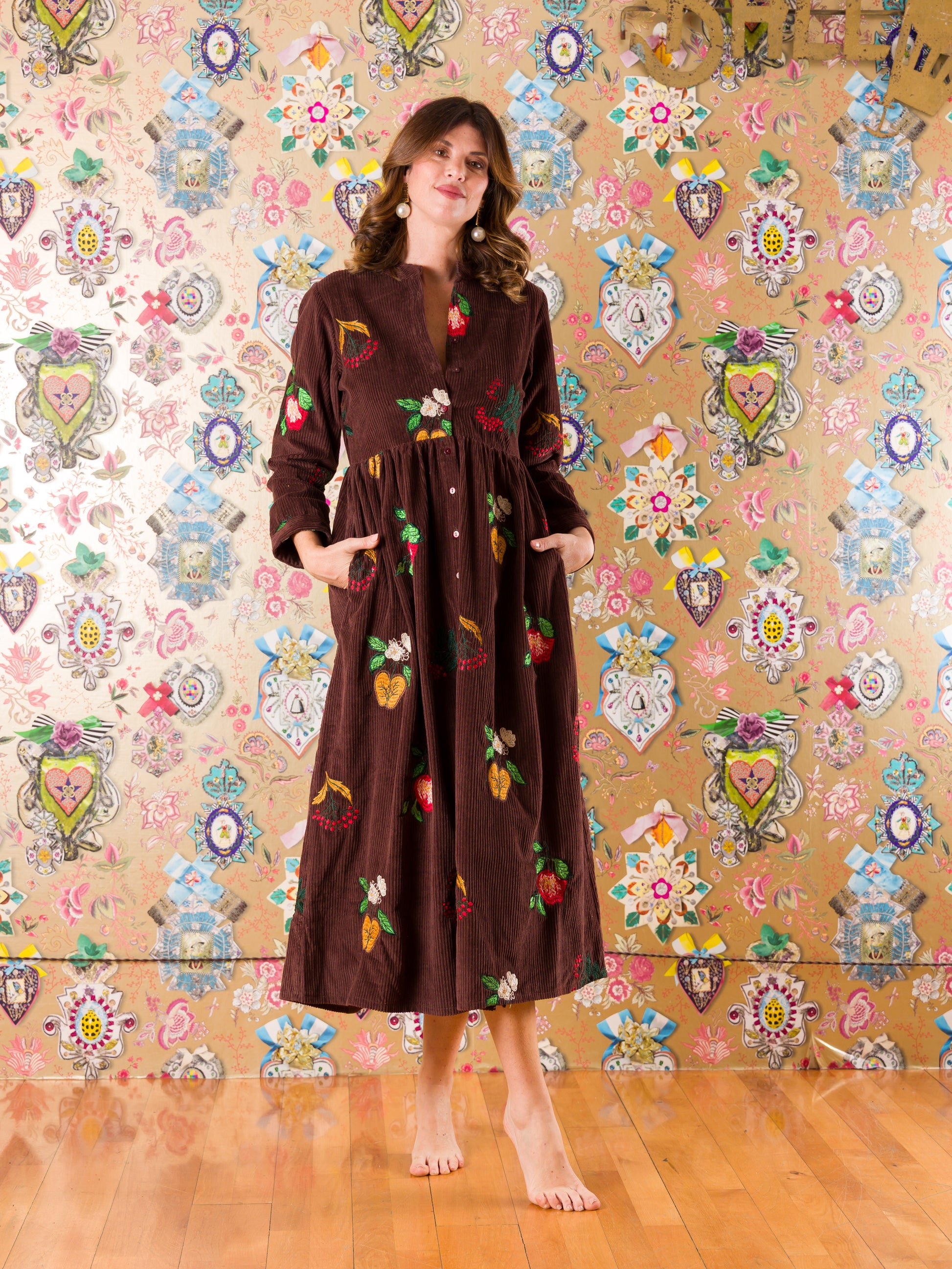 Scopri l’Abito Modane, un capo che unisce eleganza e vivacità! Realizzato in velluto a coste morbido, è impreziosito da ricami floreali a contrasto che catturano ogni sguardo. Il collo a pistagna e la chiusura completamente abbottonata davanti donano un tocco vintage, mentre la lunghezza alla caviglia ne esalta la femminilità. Pratiche tasche laterali completano il design, per un outfit che è bello e comodo, perfetto per giocare con lo stile in ogni occasione.