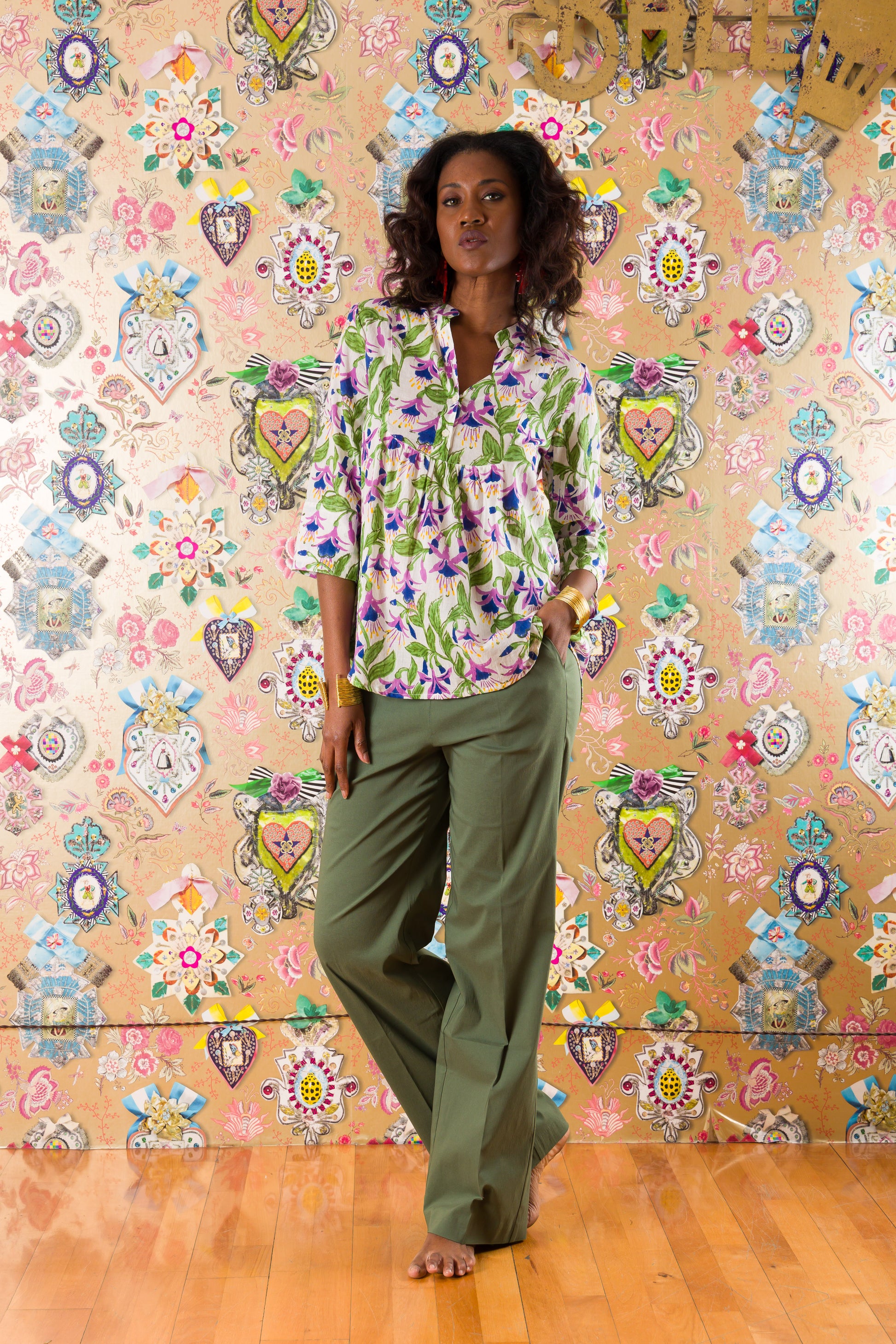 Silk shirt with 3 buttons, piping collar and 3/4 sleeves printed with the "Block Print" technique