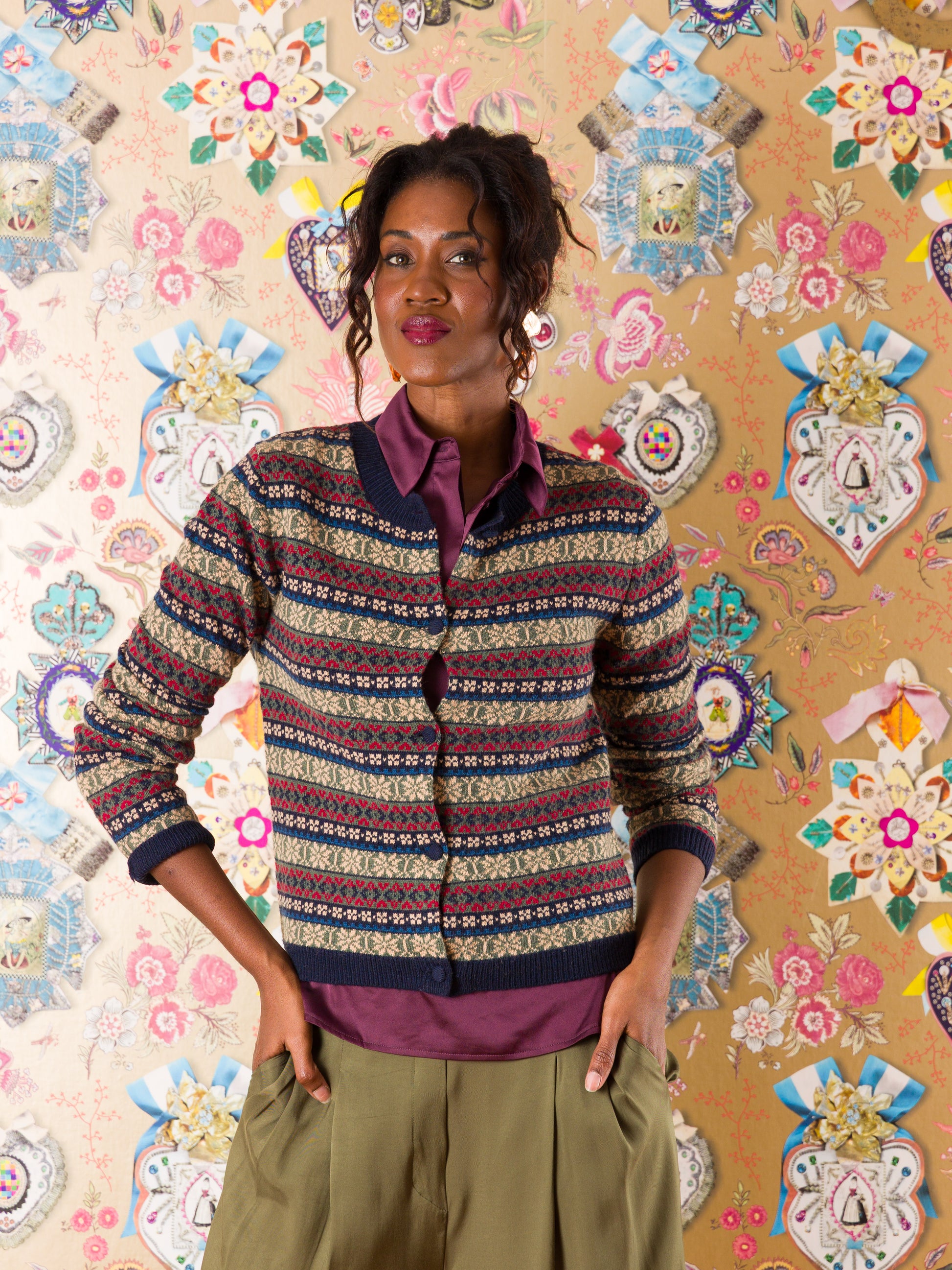 Il Cardigan Gerona è qui per rendere il tuo guardaroba irresistibile! Confezionato in morbido misto lana, questo capo gioca con stile grazie al suo affascinante pattern fair isle che cattura l'attenzione. L'abbottonatura anteriore offre libertà di stile, mentre il taglio classico e aderente valorizza la tua figura con grazia naturale. Perfetto per stratificare con eleganza o indossare da solo, è il pezzo che trasforma ogni momento in un'occasione di stile. Comfort e personalità in un unico cardigan!