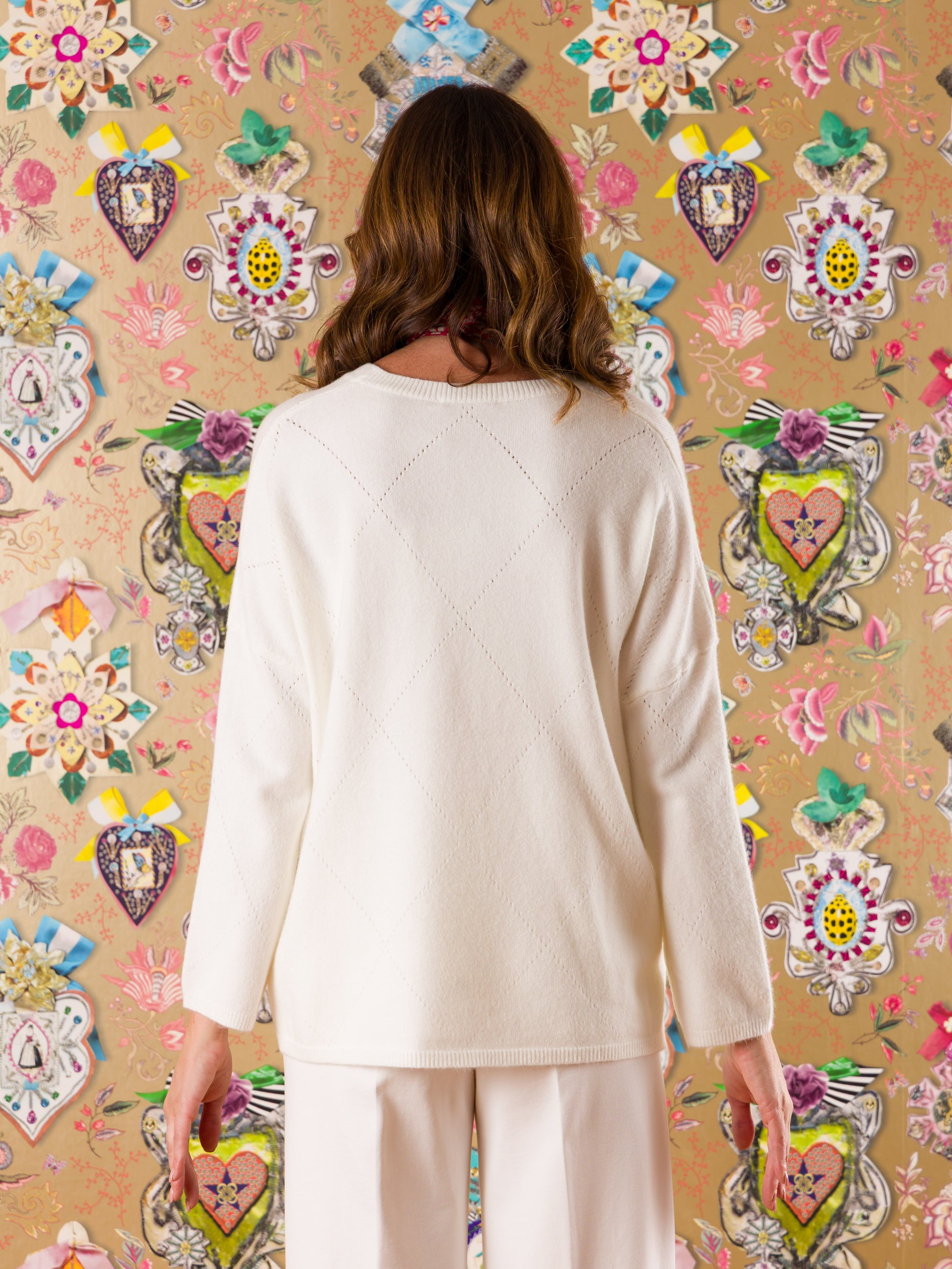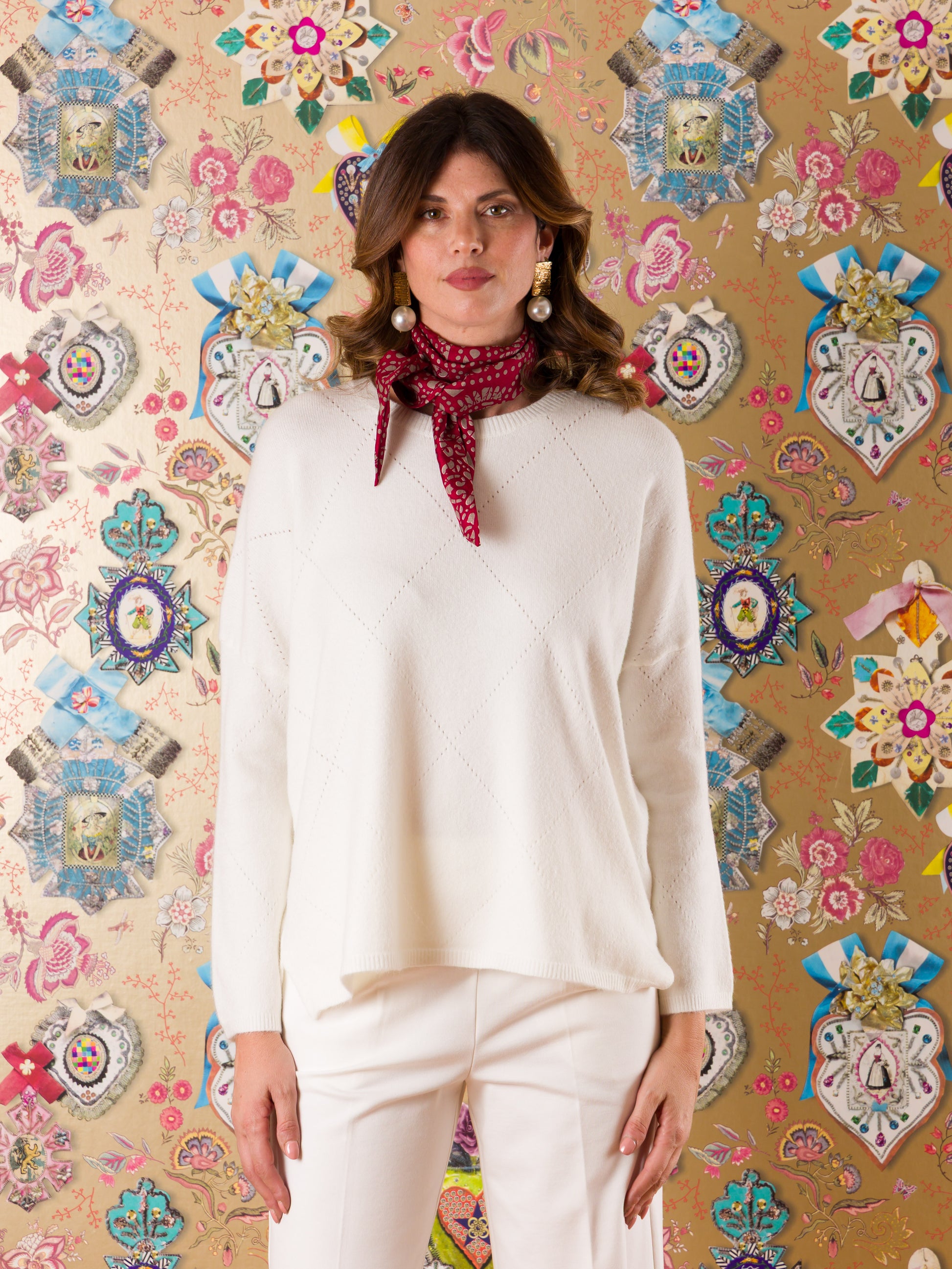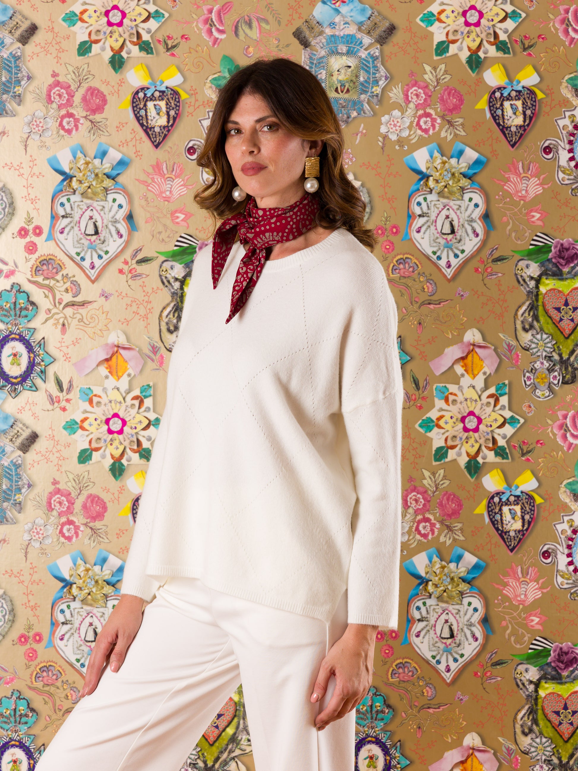 La Maglia Alicante gioca con i contrasti: tinta unita elegante e maniche lunghe decorate da un vivace motivo a losanghe. Con il suo scollo tondo, è perfetta per chi vuole un look originale e divertente senza rinunciare al comfort quotidiano. Un tocco di fantasia in ogni gesto!