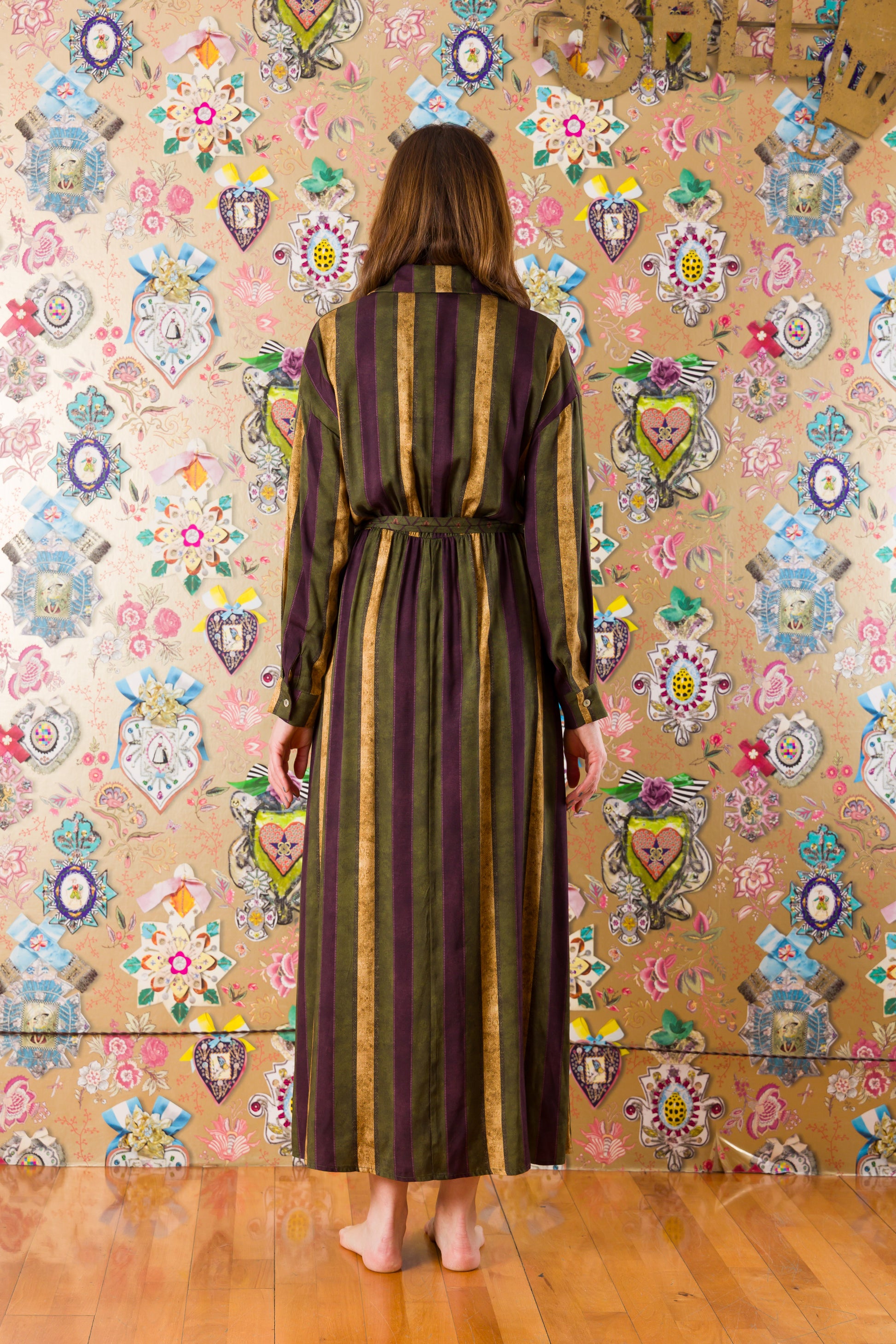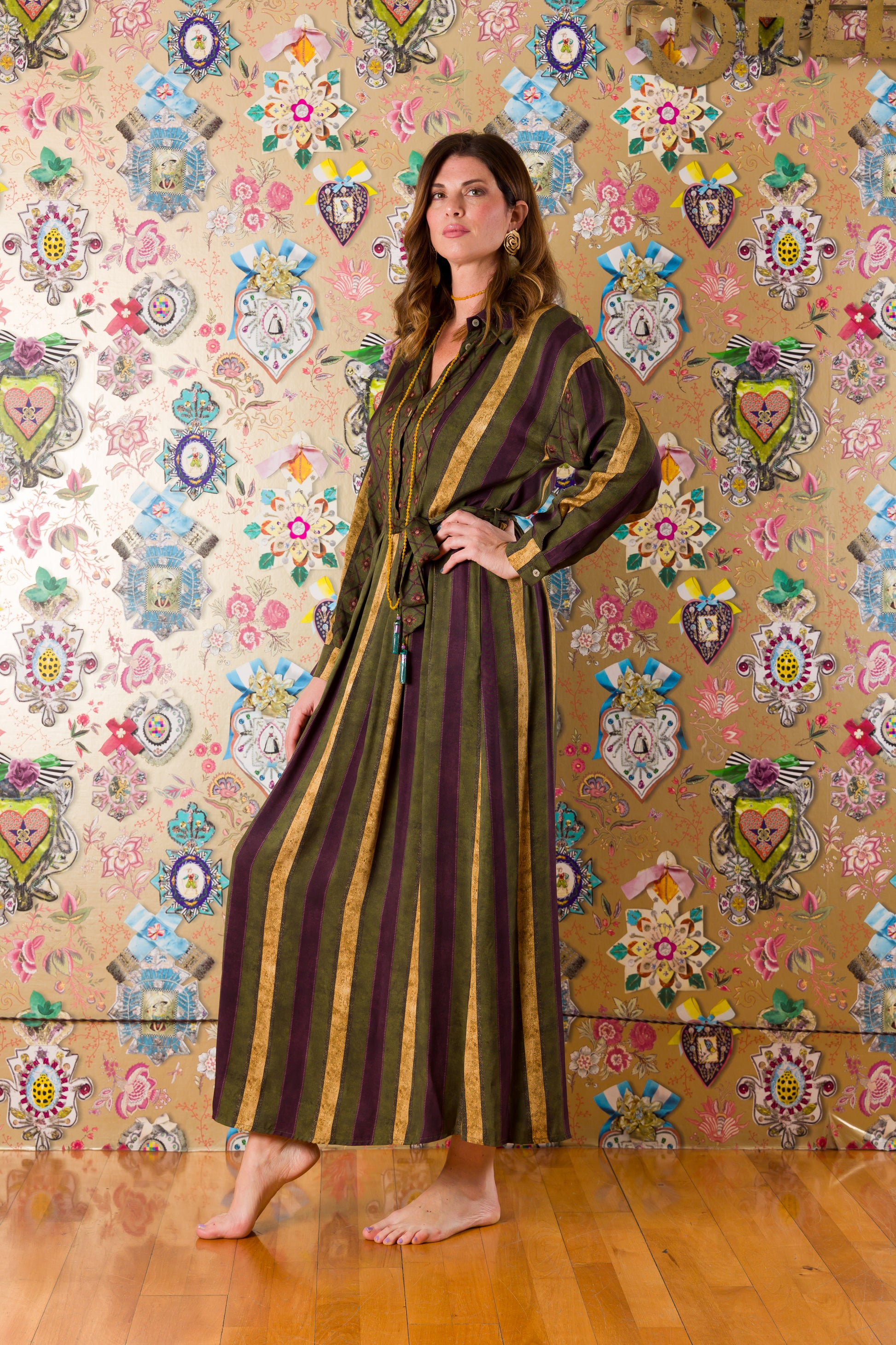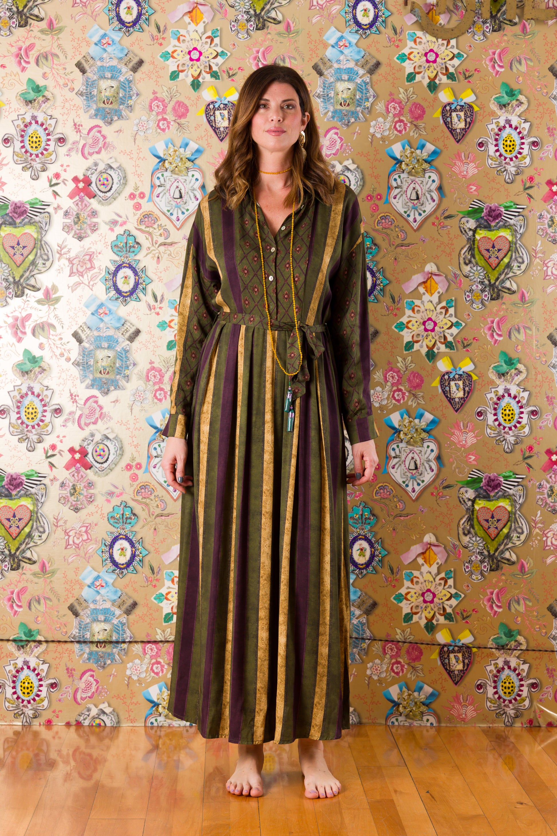 Rilassati e divertiti con l'Abito Valladolid, un'esplosione di fantasia e comodità. Lungo fino alla caviglia, in morbida viscosa a fasce verticali. Assicura una silhouette snella con la cinta in vita e un tocco di stile con il colletto da uomo. Pronto per un look unico? Allora scegli l'Abito Valladolid!