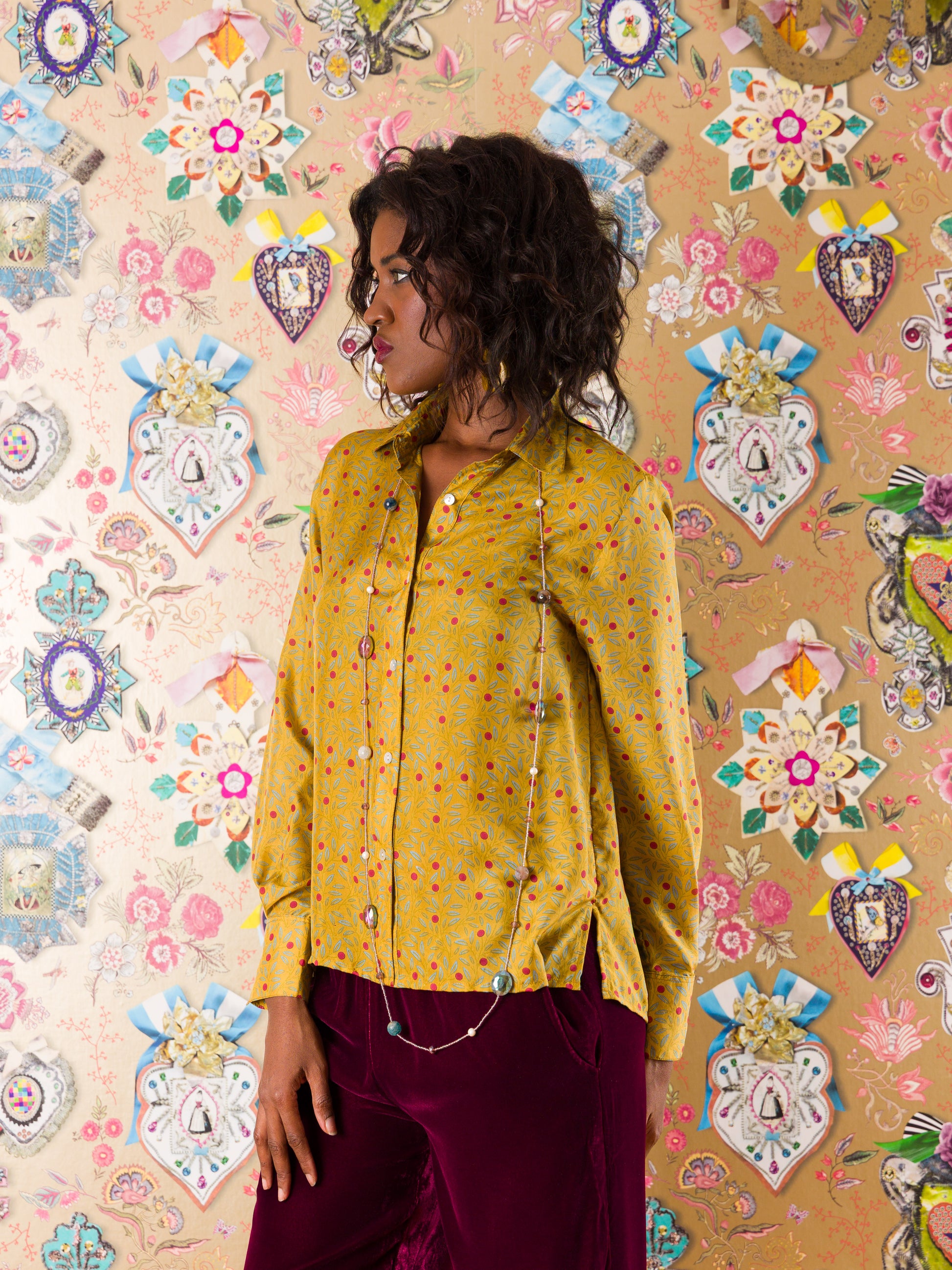 Questa camicia Parigi in seta fantasia, dal taglio maschile, unisce eleganza e divertimento in ogni dettaglio. La leggerezza della seta ti avvolge con morbidezza, mentre il motivo originale aggiunge un tocco di personalità al tuo look. Perfetta per chi ama distinguersi con stile senza prendersi troppo sul serio!