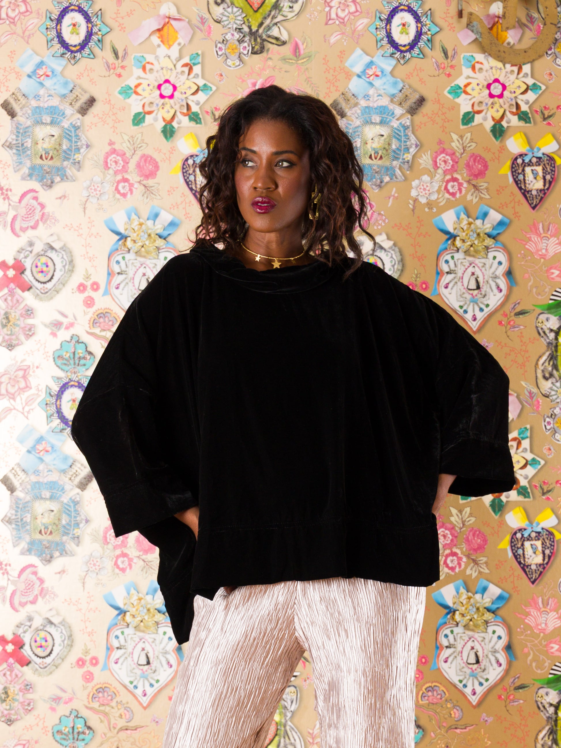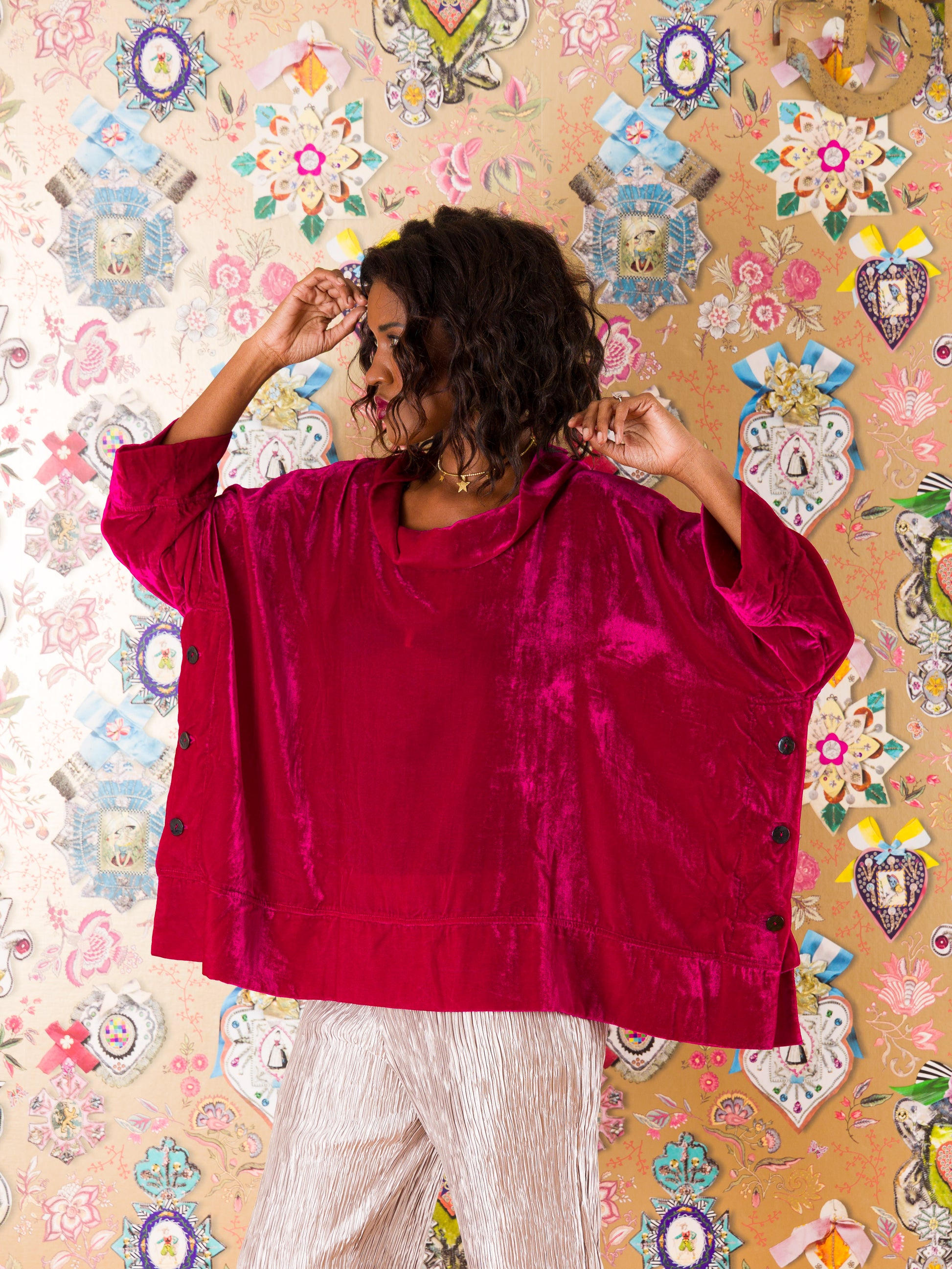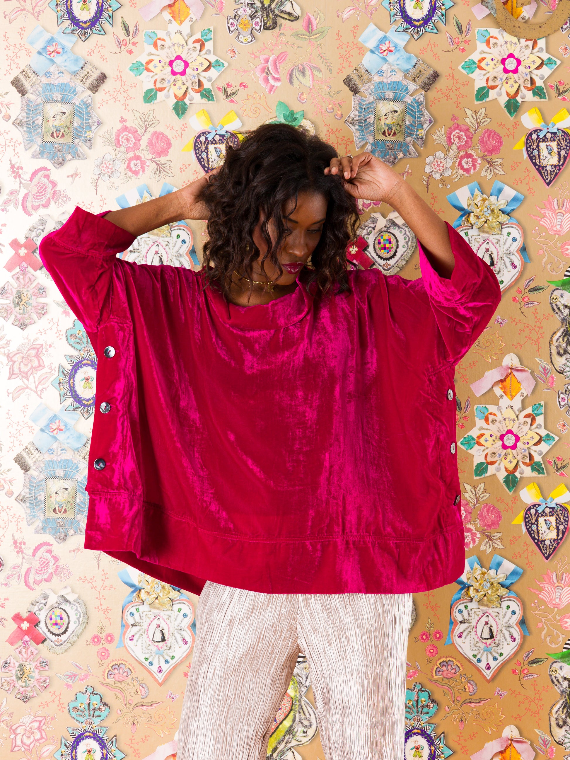 Casacca Santander in velluto di seta: il capo che sussurra eleganza a ogni movimento. Realizzata in morbidissimo velluto di seta a tinta unita, questa casacca ampia avvolge il corpo con comfort straordinario. Il collo alto definisce il décolleté, mentre gli spacchi laterali con bottoni regalano libertà di movimento e un tocco di sofisticatezza. Taglia unica che veste fino alla 52, perfetta per chi ama le silhouette generose e avvolgenti. Un'armatura di stile per chi non sceglie mai compromessi tra comfort e fascino.