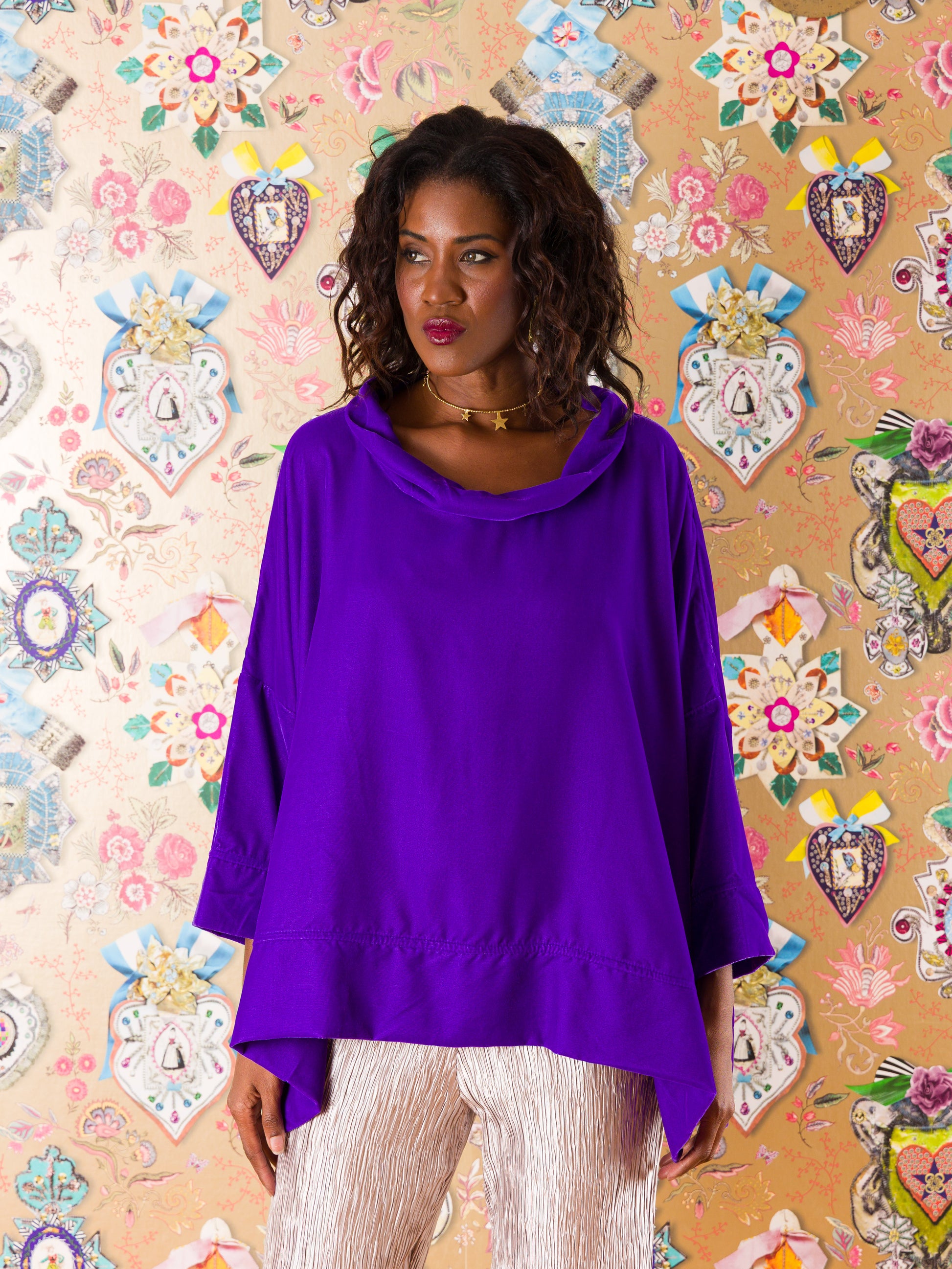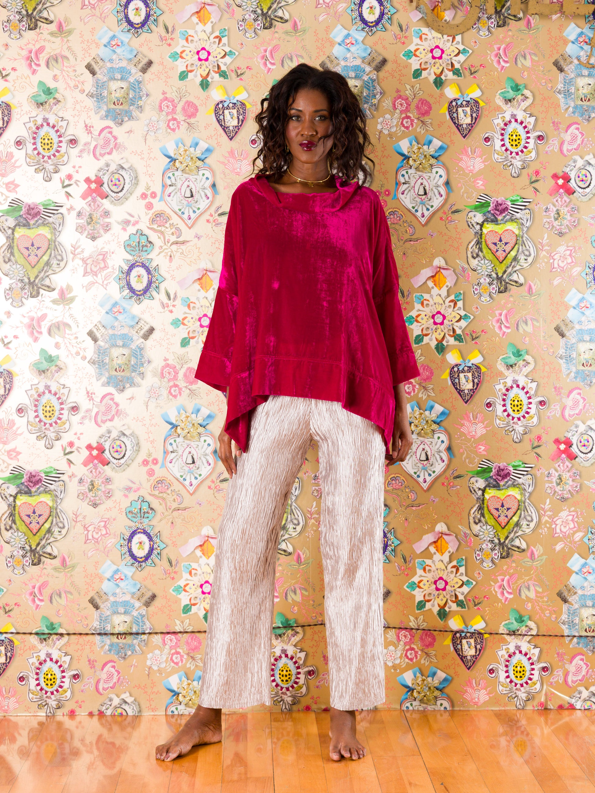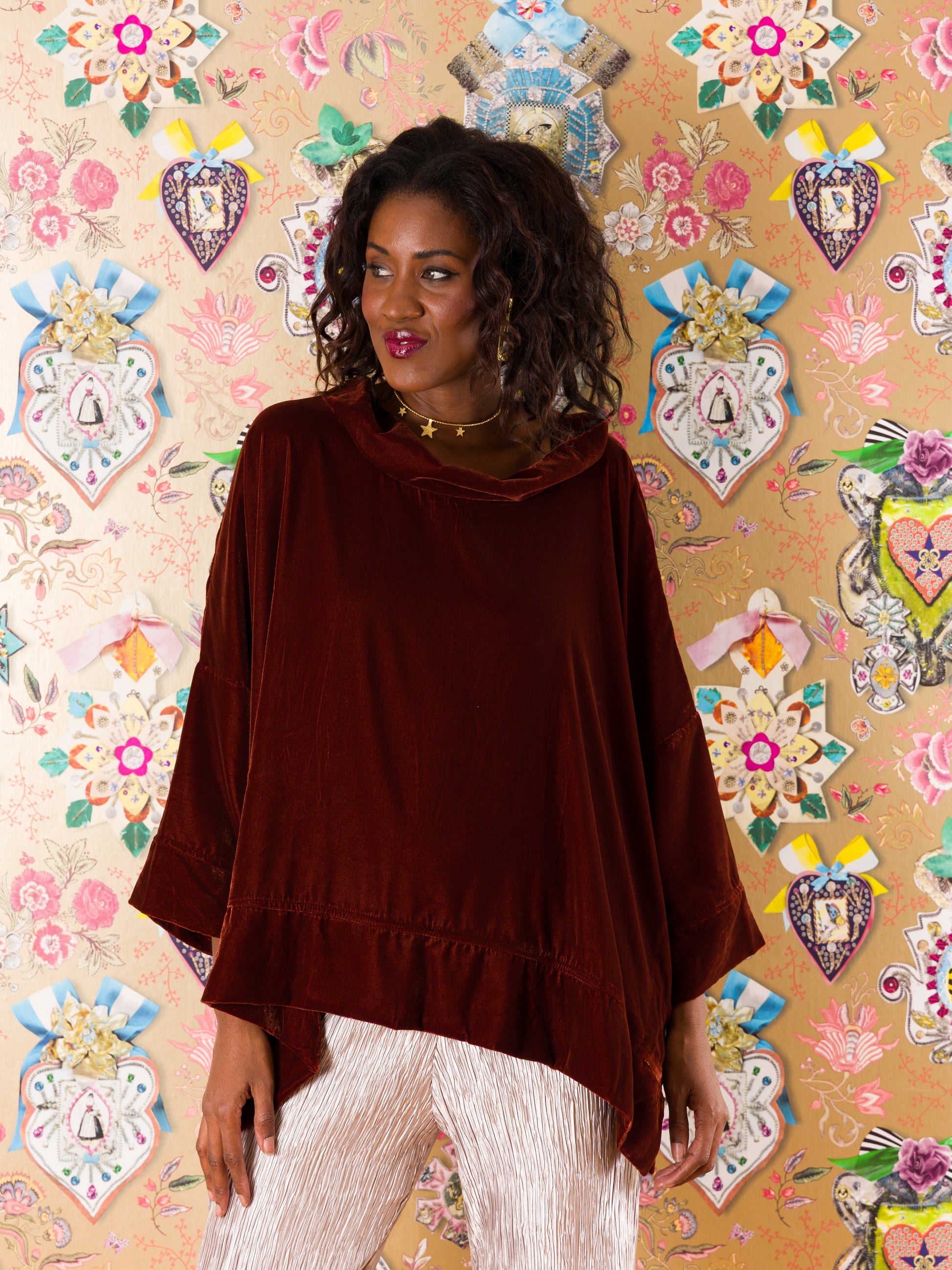 Casacca Santander in velluto di seta: il capo che sussurra eleganza a ogni movimento. Realizzata in morbidissimo velluto di seta a tinta unita, questa casacca ampia avvolge il corpo con comfort straordinario. Il collo alto definisce il décolleté, mentre gli spacchi laterali con bottoni regalano libertà di movimento e un tocco di sofisticatezza. Taglia unica che veste fino alla 52, perfetta per chi ama le silhouette generose e avvolgenti. Un'armatura di stile per chi non sceglie mai compromessi tra comfort e fascino.
