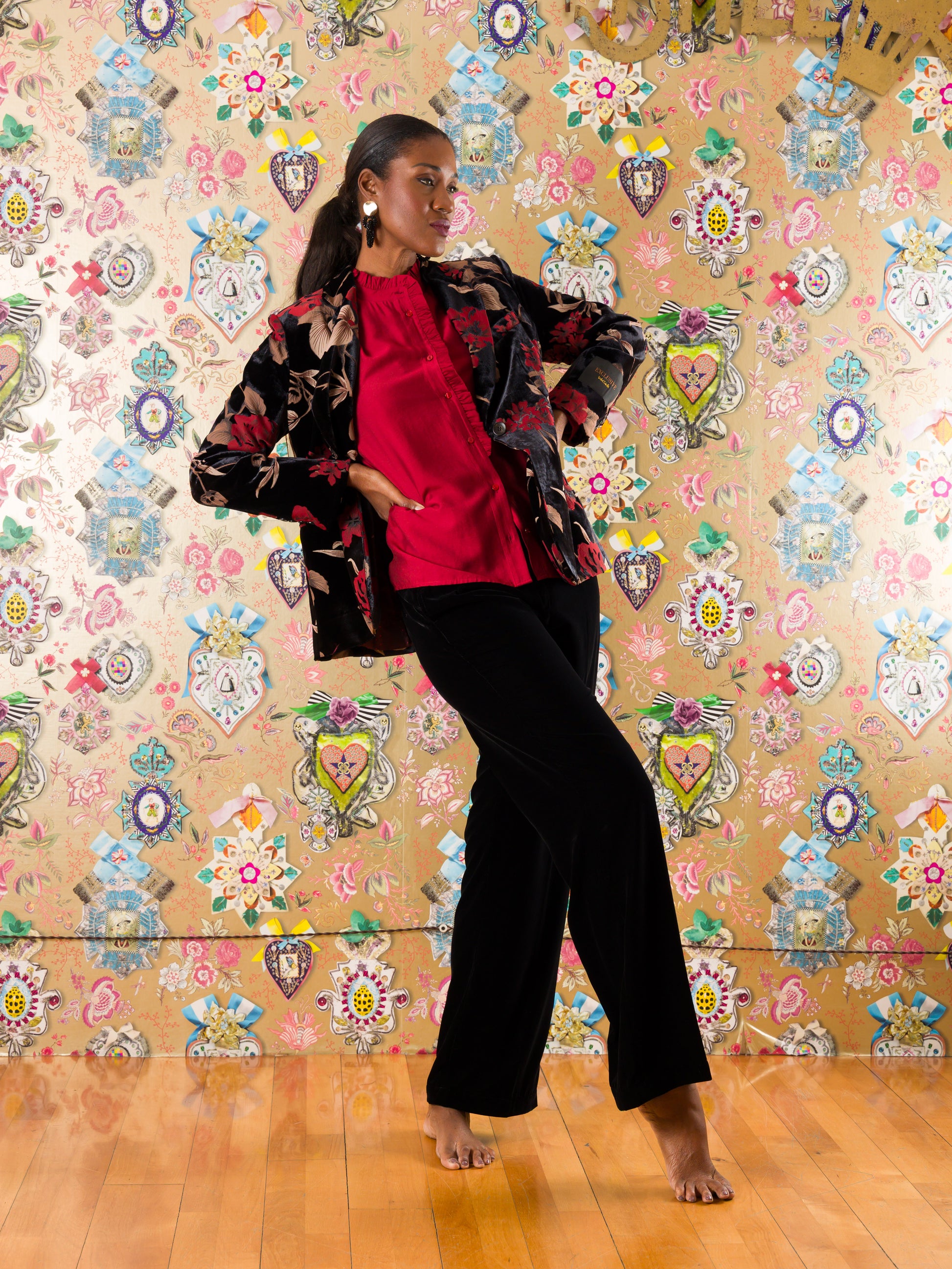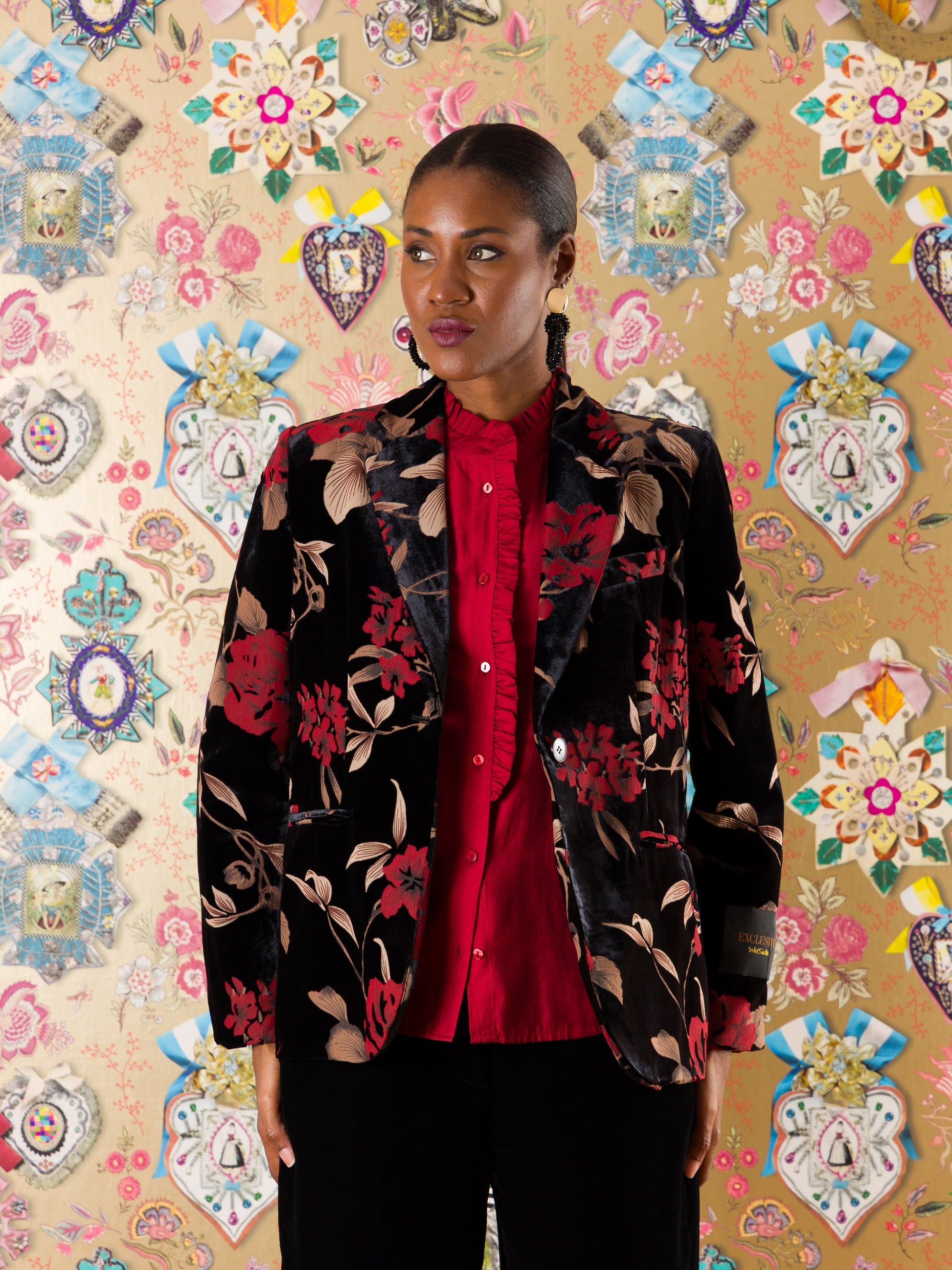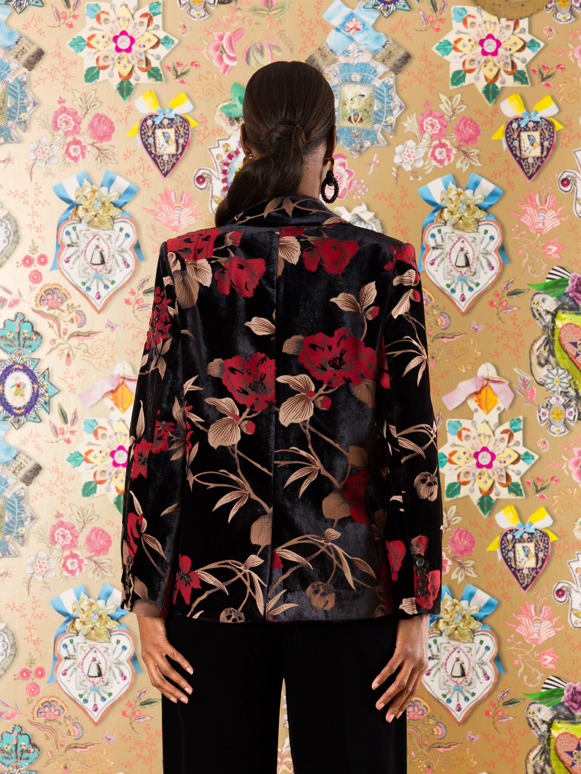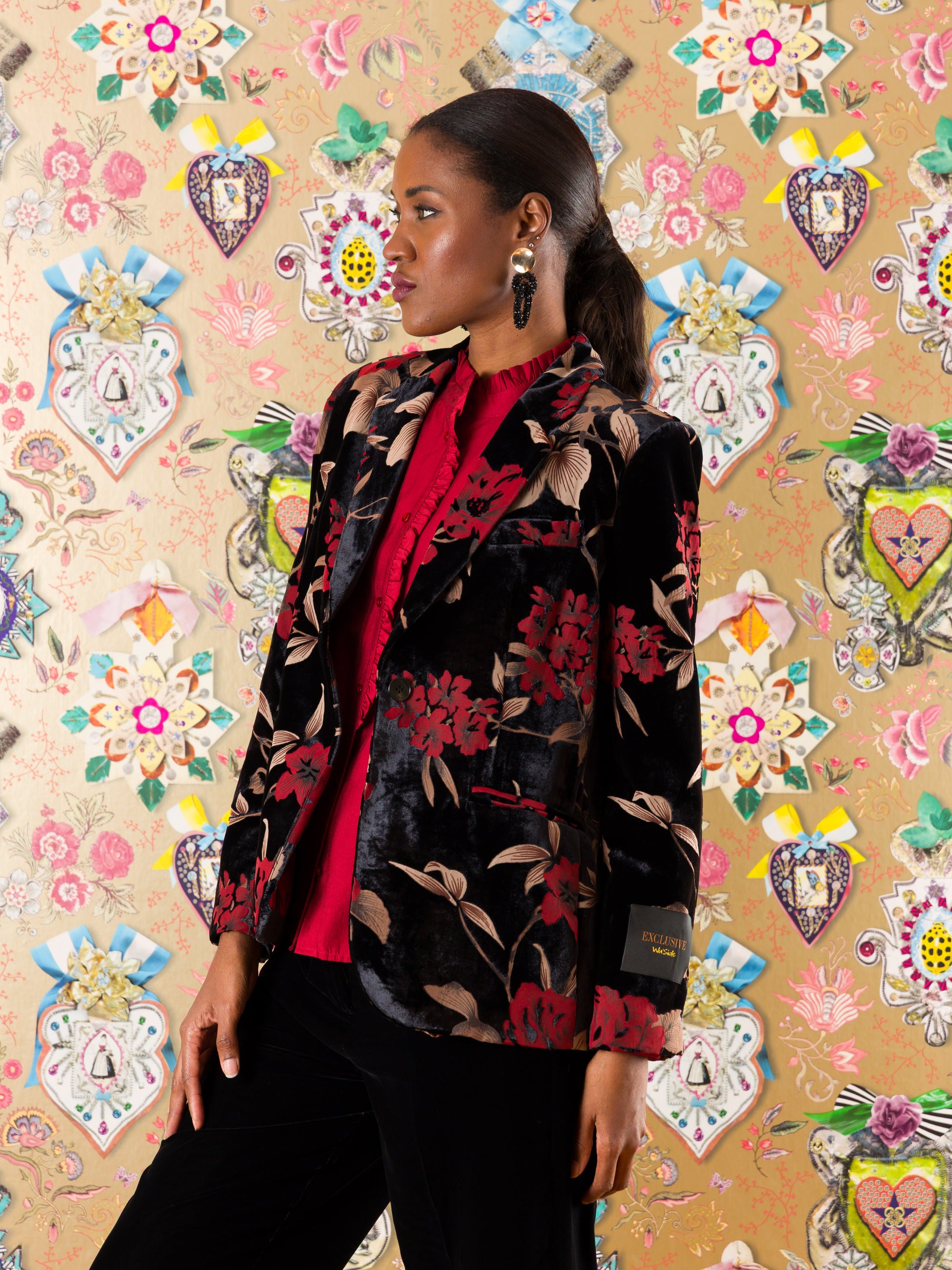 La giacca Chambery in velluto devorè è la compagna ideale per chi ama il fascino floreale e uno stile unico. Con un solo bottone e un motivo floreale che danza sul tessuto, questa giacca trasforma ogni look in un’avventura di eleganza e colore. Divertiti a indossarla e a farti notare!