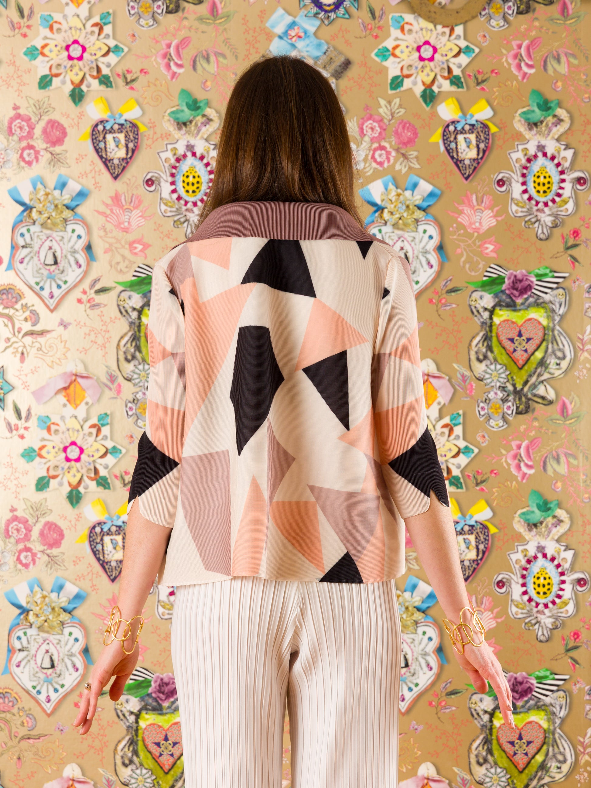 Giacca elegante in tessuto crinkle plissettato che regala movimento e texture sofisticata. Caratterizzata da un ampio collo che incornicia il viso e da un'abbottonatura frontale pratica. Le maniche a 3/4 la rendono versatile per ogni stagione, mentre la fantasia geometrica dona un tocco contemporaneo e originale. Perfetta per chi ricerca uno stile raffinato con un dettaglio di carattere.