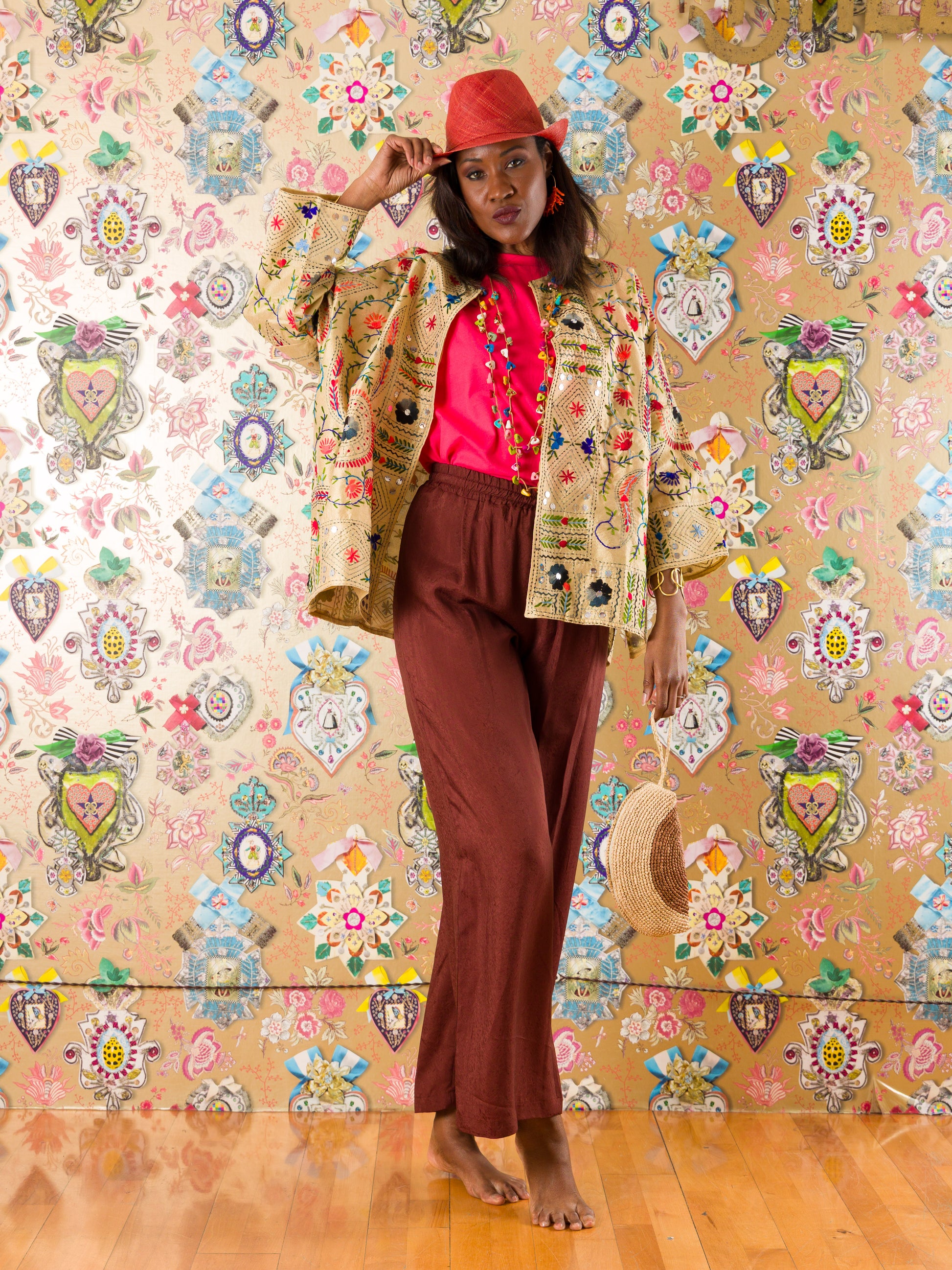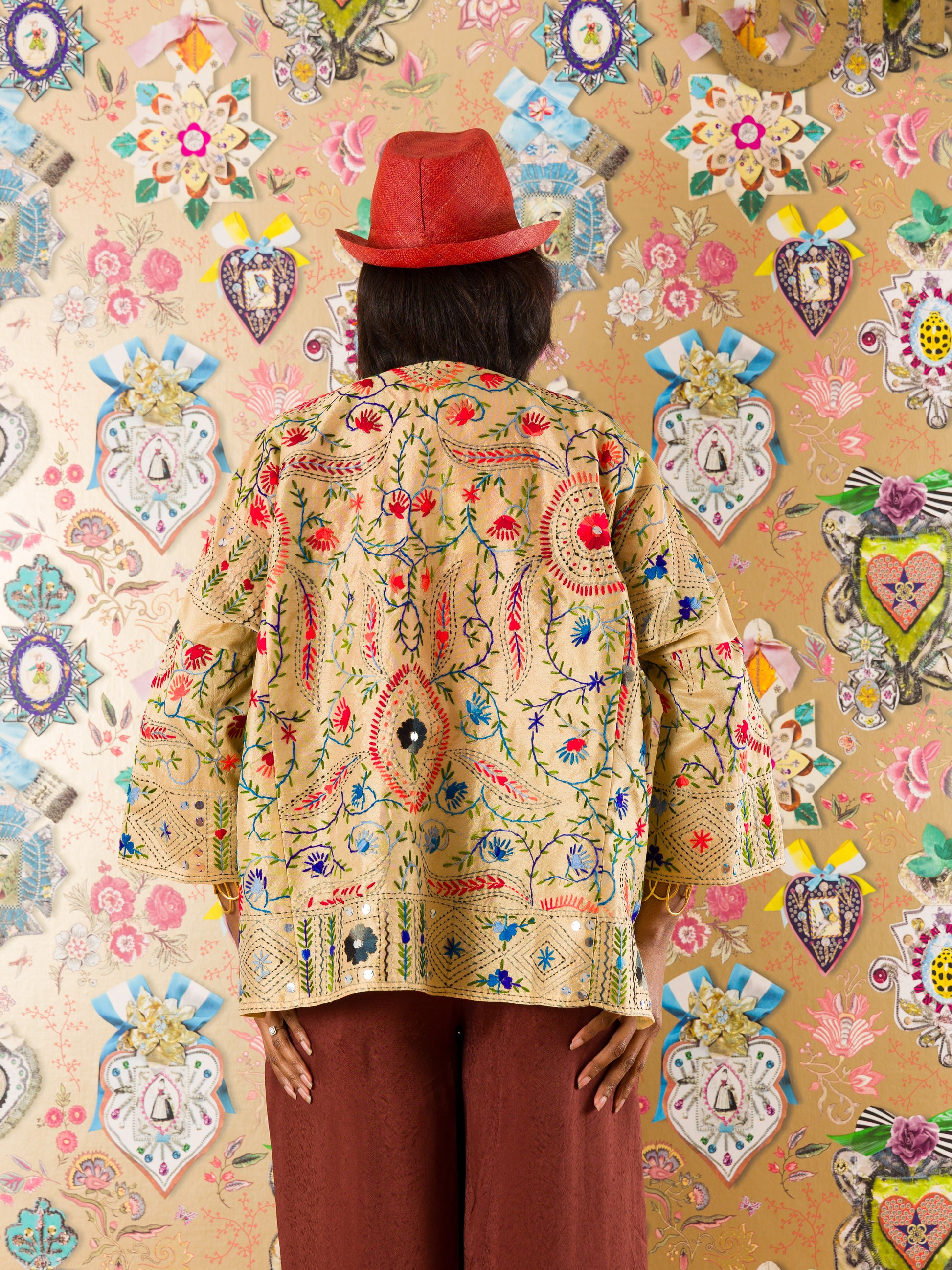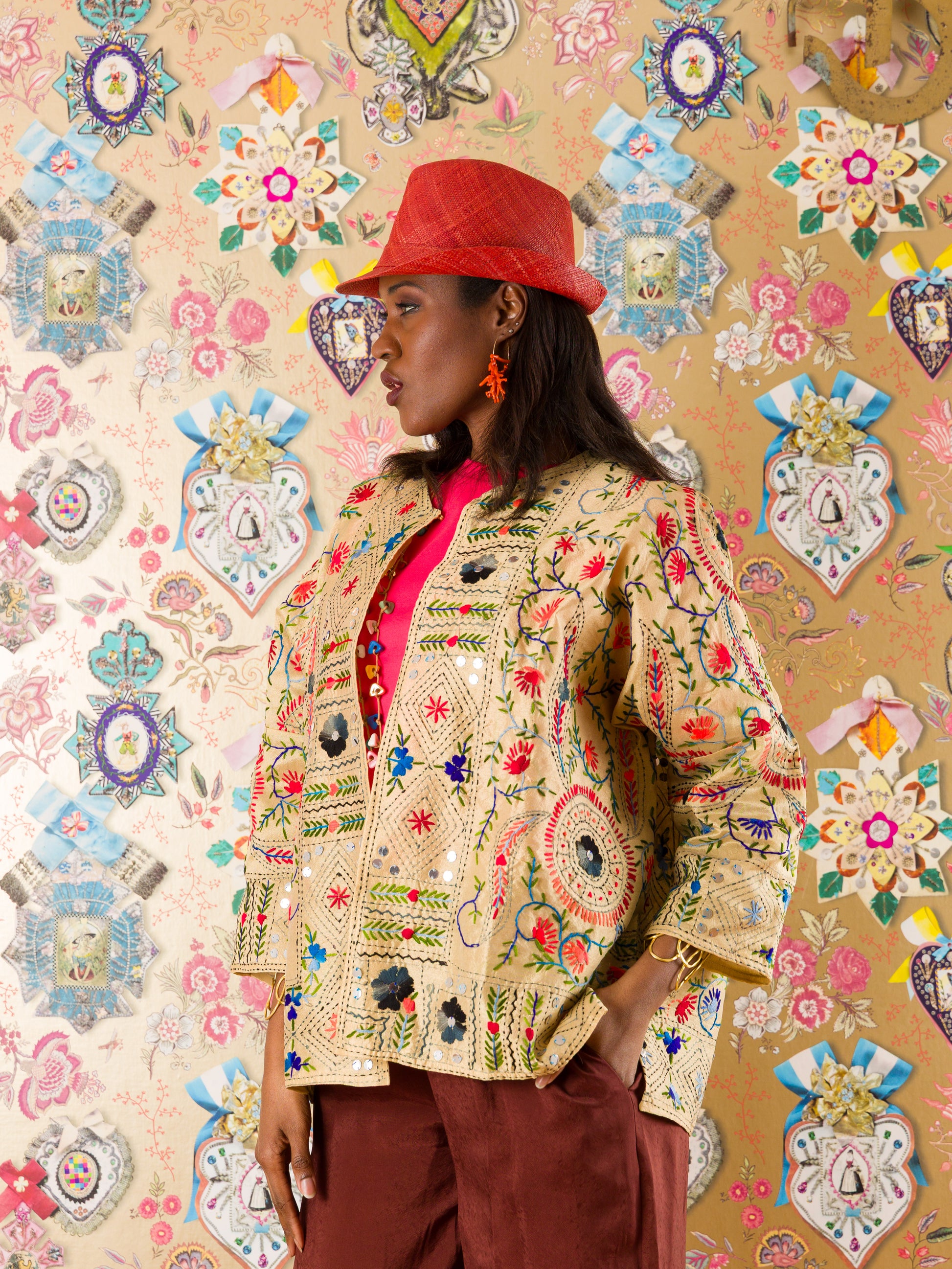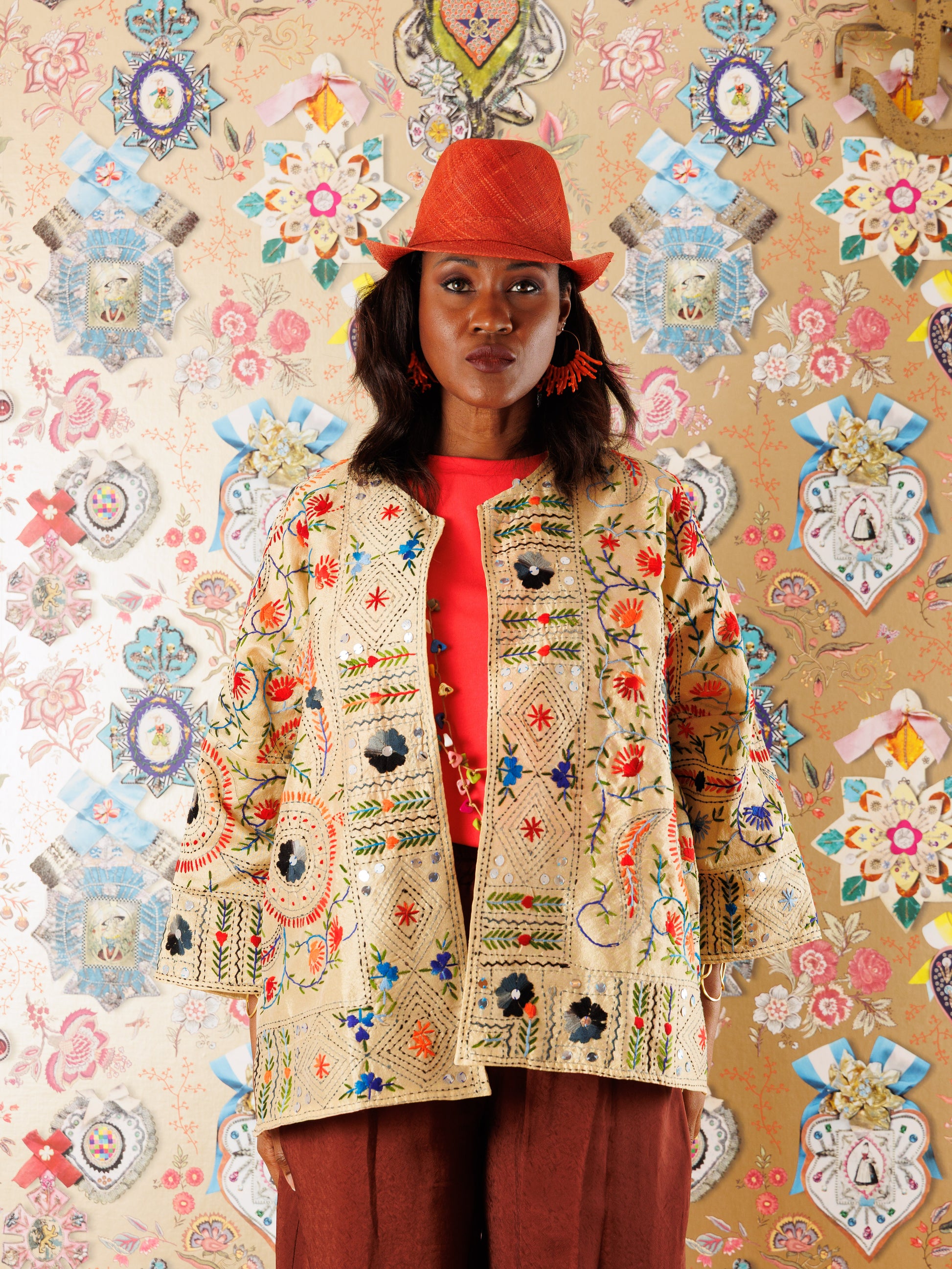Giacca in organza leggera e raffinata, impreziosita da ricami Madhubani autentici che rendono ogni pezzo unico e irripetibile. La silhouette ampia e squadrata regala comfort e eleganza, mentre gli spacchetti laterali aggiungono movimento e praticità. Chiusura frontale con gancio rivestito e maniche lunghe completano il design. Taglia unica, ideale fino alla 50. Un capo che unisce tradizione artigianale e contemporaneità, perfetto per chi ricerca originalità e qualità.