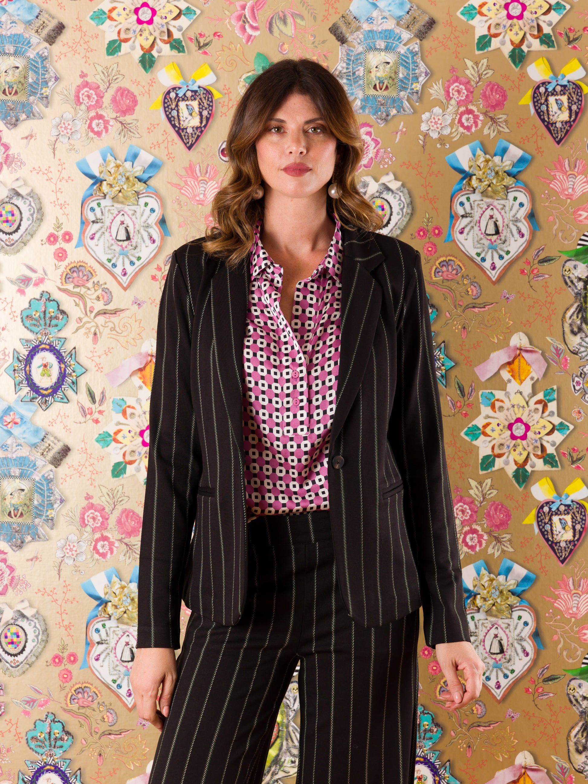 La Giacca Nancy è il blazer gessato perfetto per chi vuole aggiungere un tocco di stile con un pizzico di personalità. Con il suo collo a revers classico, chiusura con un solo bottone e tasche a filetto, questa giacca dalla vestibilità sartoriale ti farà sentire elegante ma mai noiosa. Spalle definite e maniche lunghe completano il look, rendendola la compagna ideale per le tue avventure di stile quotidiane.