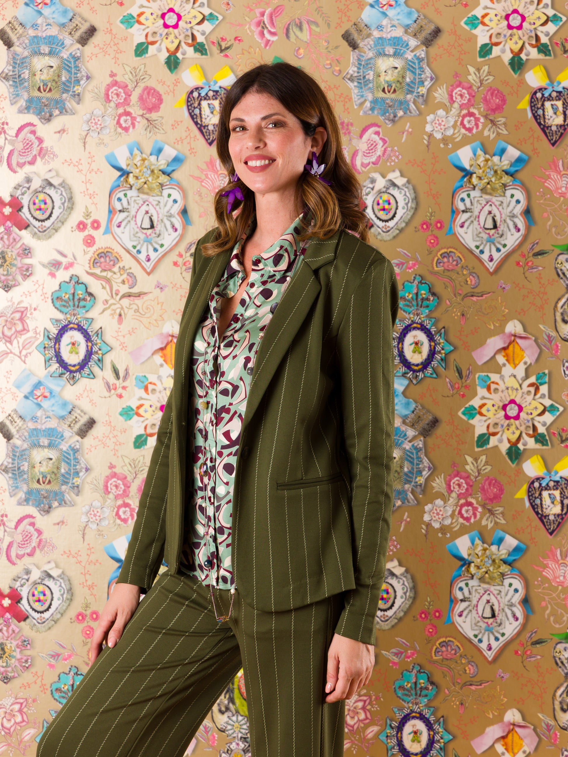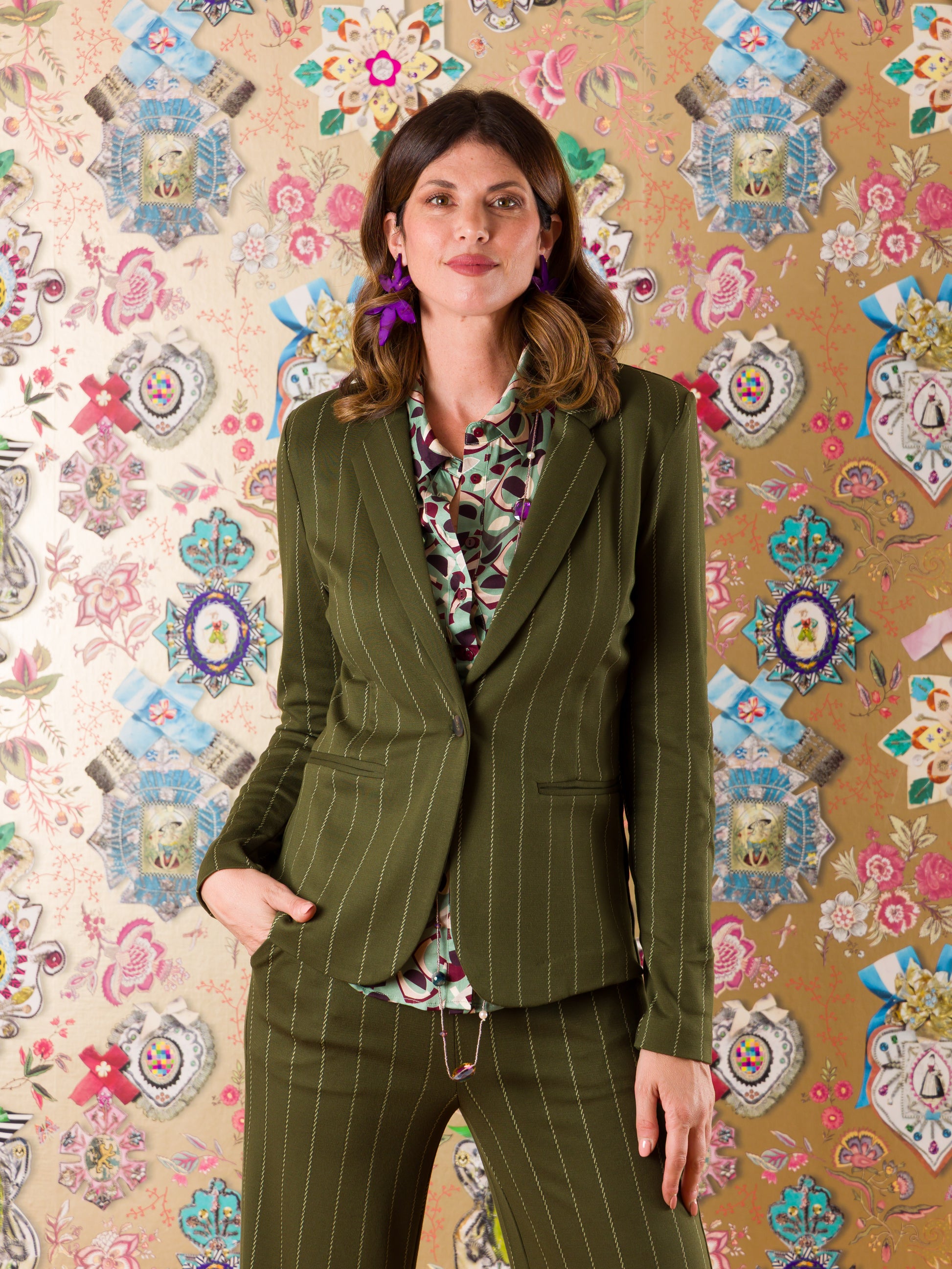 La Giacca Nancy è il blazer gessato perfetto per chi vuole aggiungere un tocco di stile con un pizzico di personalità. Con il suo collo a revers classico, chiusura con un solo bottone e tasche a filetto, questa giacca dalla vestibilità sartoriale ti farà sentire elegante ma mai noiosa. Spalle definite e maniche lunghe completano il look, rendendola la compagna ideale per le tue avventure di stile quotidiane.
