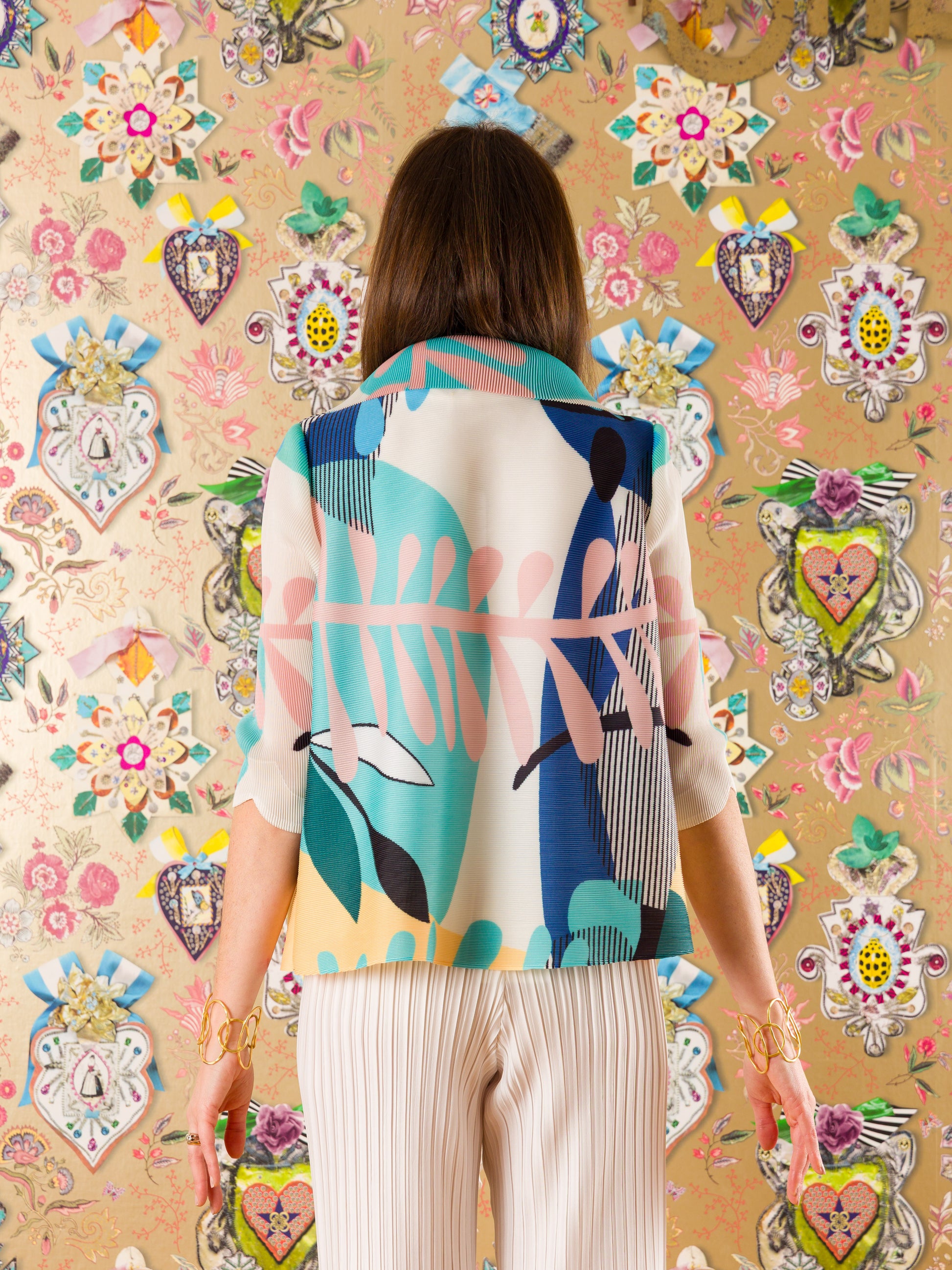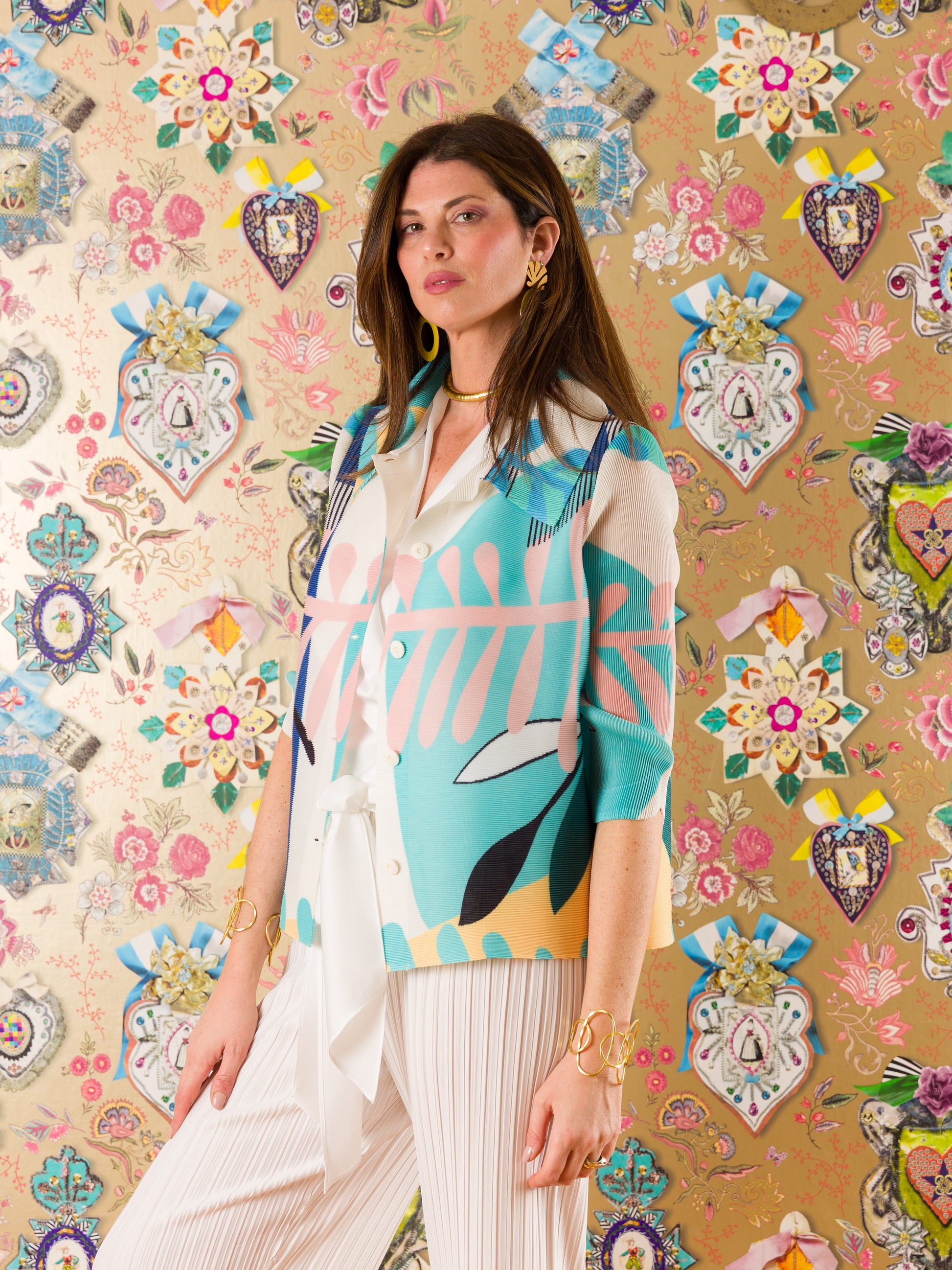 Giacca elegante in tessuto crinkle plissettato che regala movimento e texture sofisticata. Caratterizzata da un ampio collo che incornicia il viso e da un'abbottonatura frontale pratica. Le maniche a 3/4 la rendono versatile per ogni stagione, mentre la fantasia geometrica dona un tocco contemporaneo e originale. Perfetta per chi ricerca uno stile raffinato con un dettaglio di carattere.
