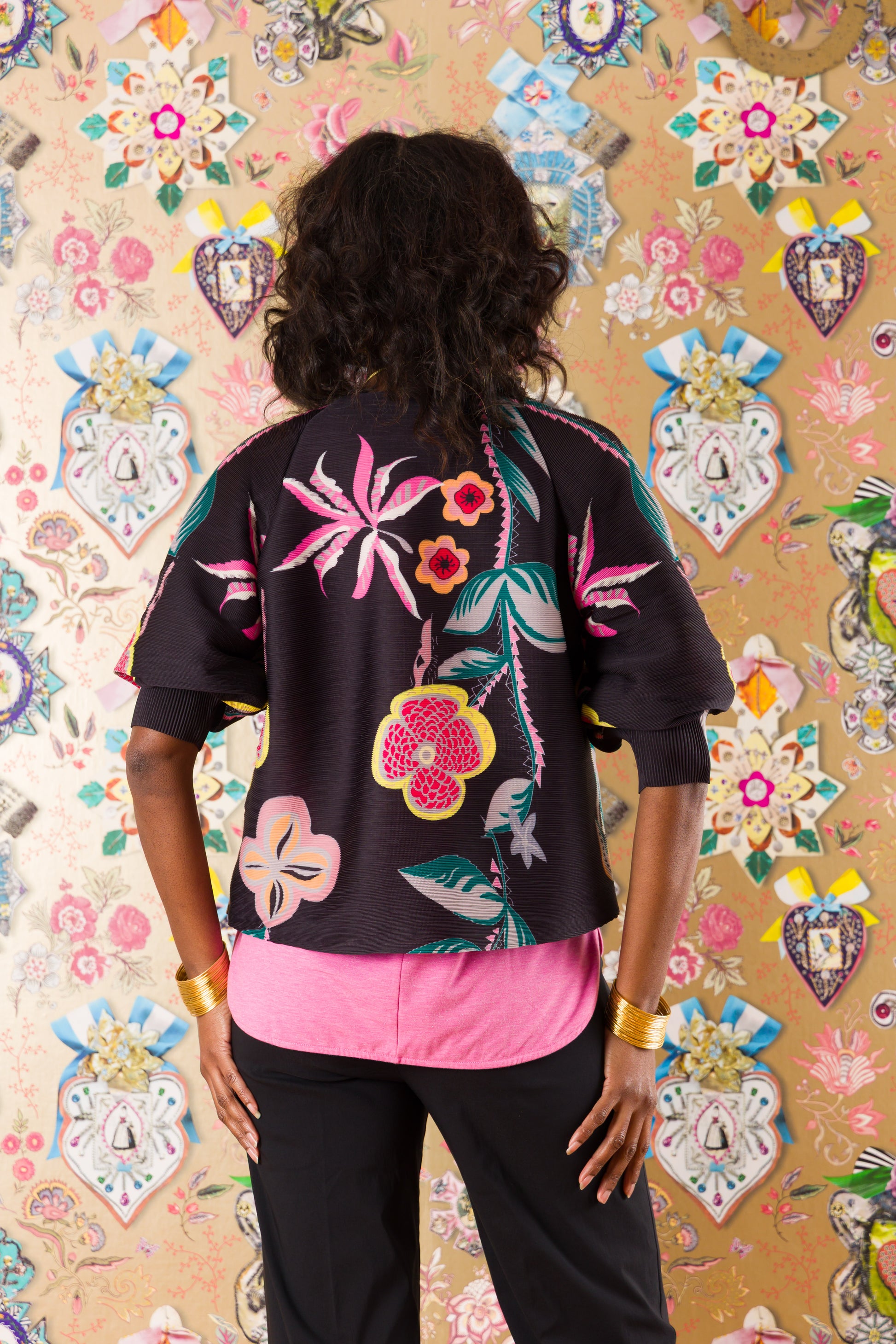 Giacca in tessuto crinkle che cattura lo spirito estivo con la sua texture stropicciata e leggera. La fantasia floreale vivace si sviluppa su tutta la superficie, mentre le maniche a 3/4 offrono la giusta proporzione tra copertura e libertà di movimento. Lo scollo tondo morbido completa il design elegante e versatile, perfetto per creare look casual chic da indossare in qualsiasi occasione.