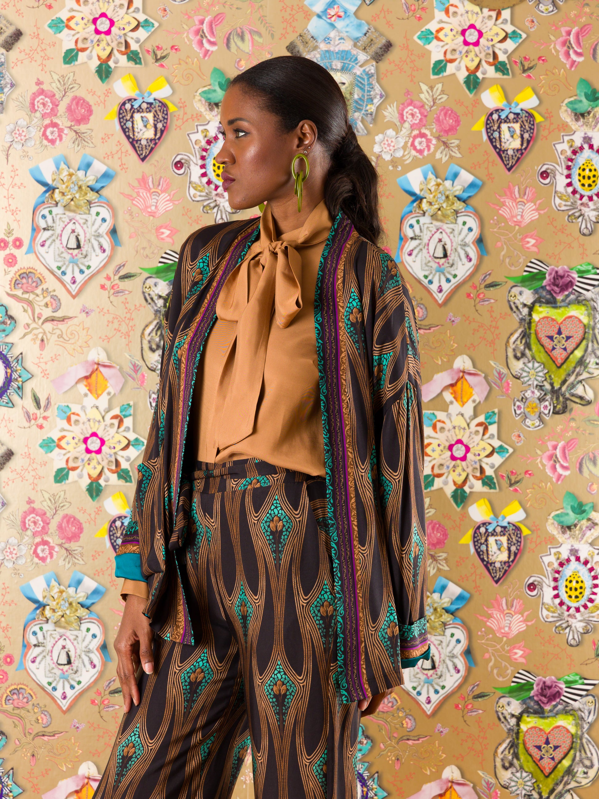 Kimono corto in viscosa dal design fluido e contemporaneo. La fantasia colorata e i toni vivaci infondono freschezza e personalità a ogni look. Leggero e scorrevole, è un capo versatile che aggiunge un tocco di allegria al tuo stile di tutti i giorni.