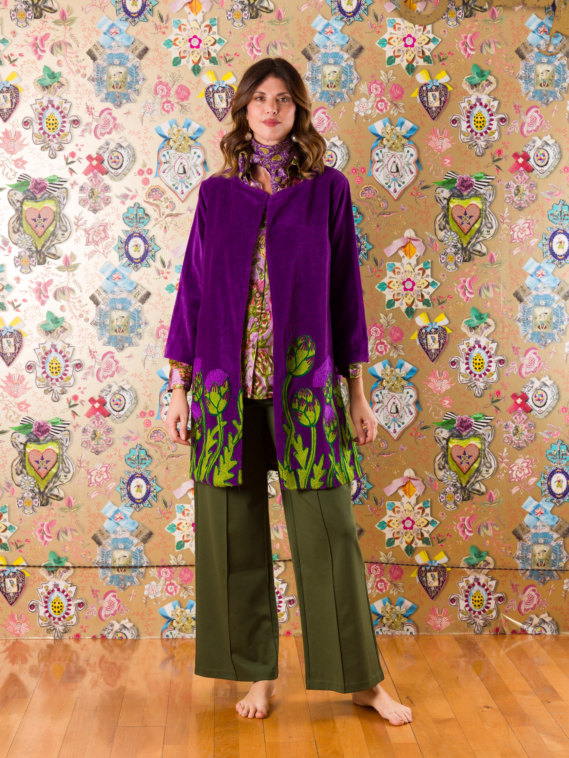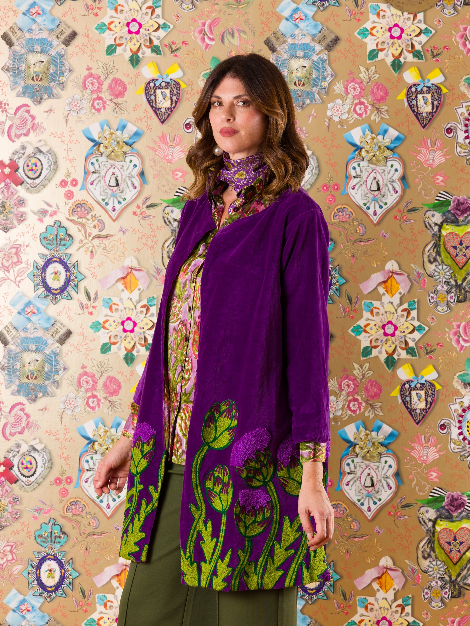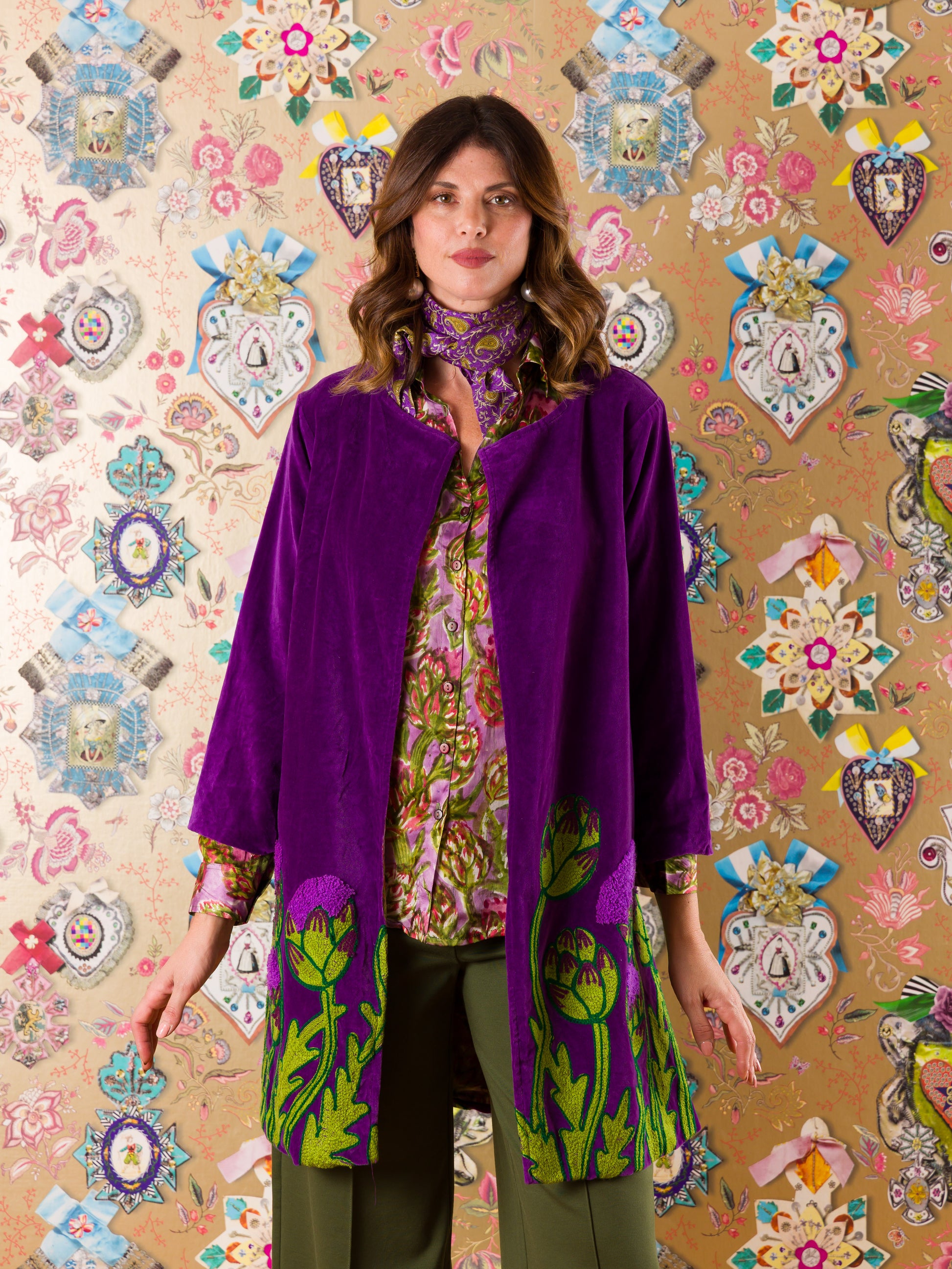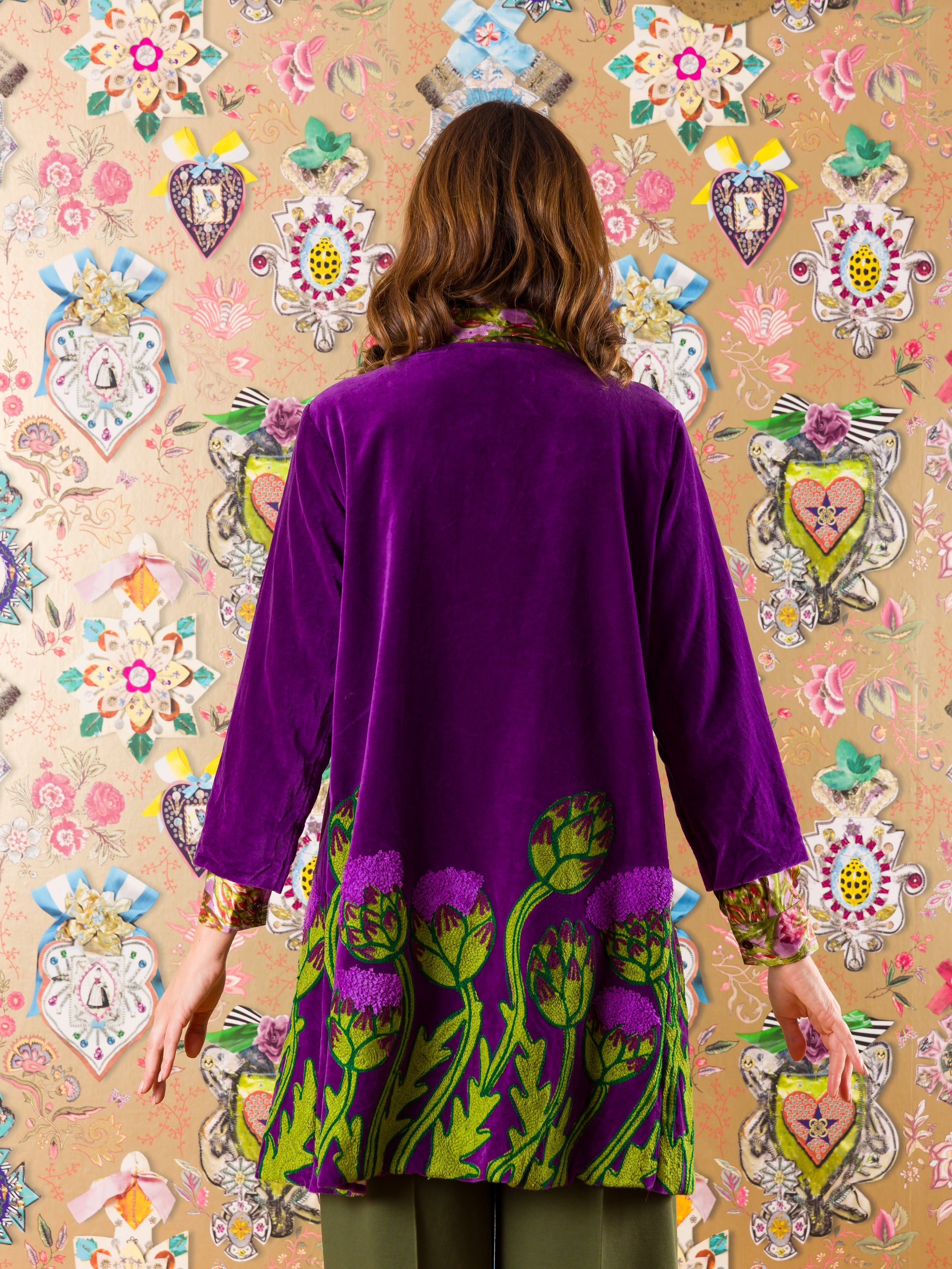 Il Spolverino Dunkerque in velluto tinta unita ti avvolge con gusto e leggerezza. I ricami floreali sul fondo aggiungono un tocco di magia artigianale, mentre la fodera a fantasia floreale a contrasto sorprende a ogni movimento. Perfetto per chi ama giocare con il proprio stile senza rinunciare a comfort e originalità.
