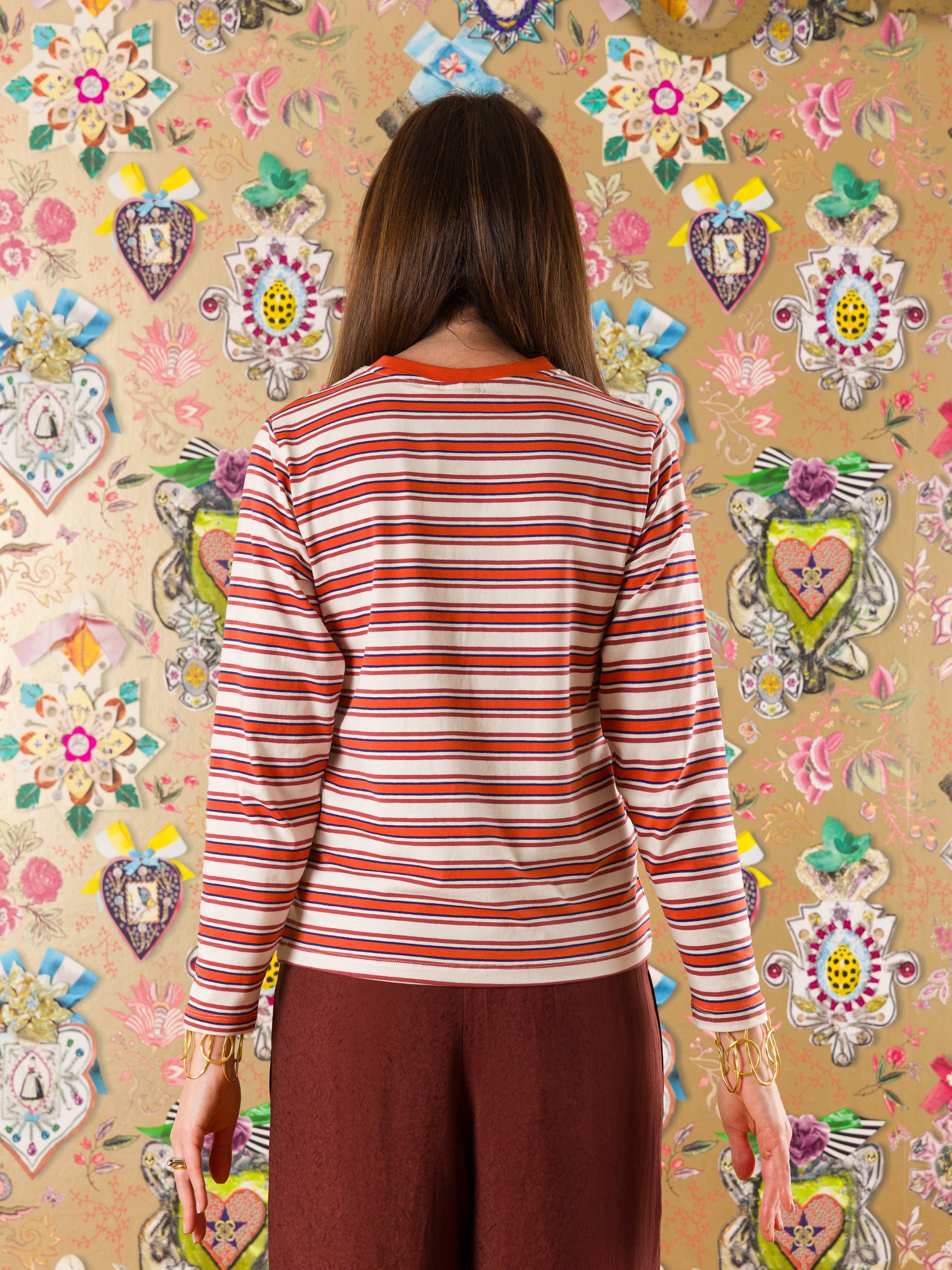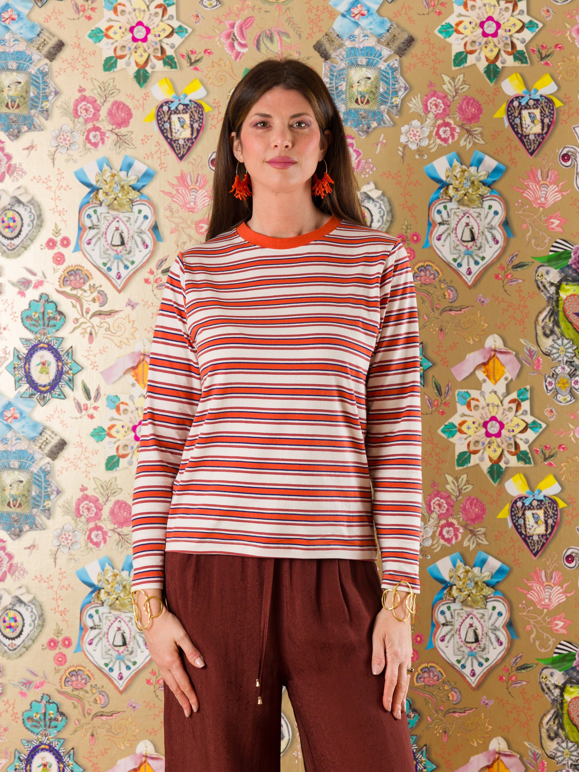T-shirt in cotone elasticizzato che unisce comfort e stile. Realizzata con maniche lunghe e caratterizzata da righe orizzontali a contrasto, è perfetta per un look casual e versatile. Il tessuto elasticizzato garantisce libertà di movimento e una vestibilità impeccabile durante tutta la giornata. Ideale per chi ricerca qualità e design senza compromessi.